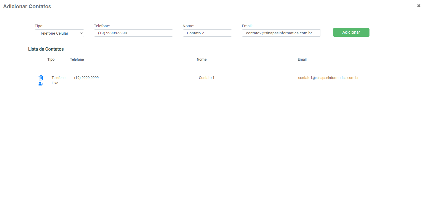 Selecionando esta opção é possível adicionar quantos contatos forem necessários, inserindo um telefone (fixo ou celular), nome e e-mail. Em seguida, basta clicar em “Adicionar” e este meio de contato estará vinculado ao Lead.