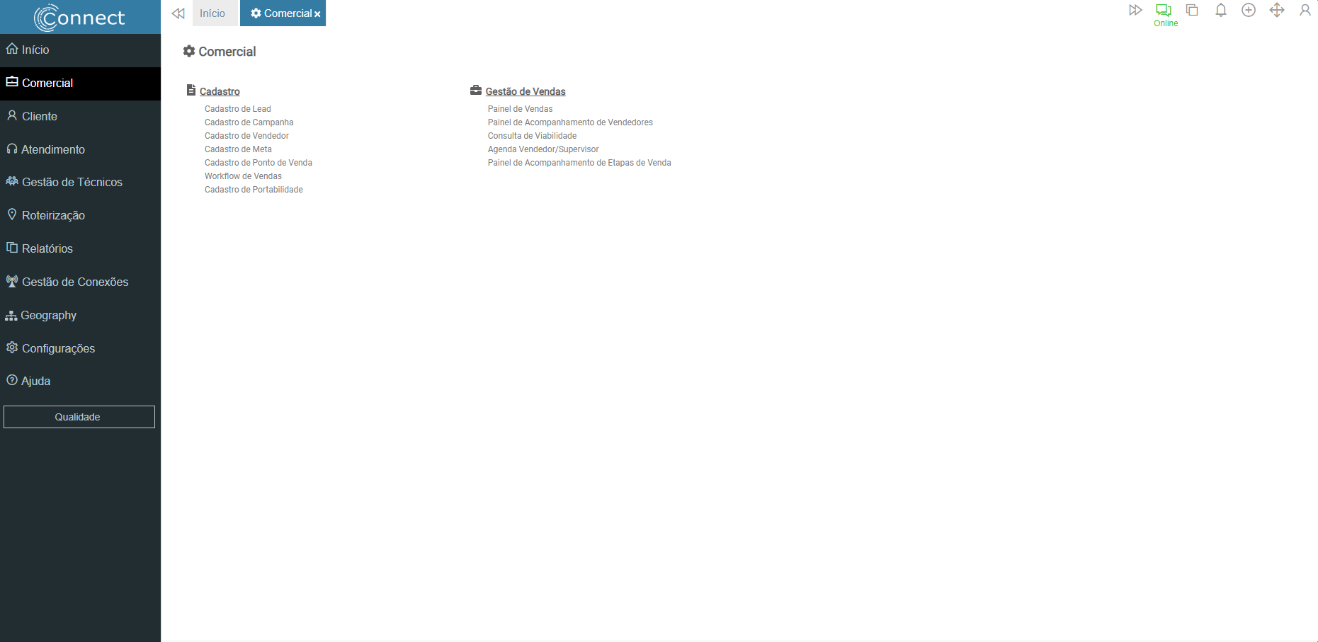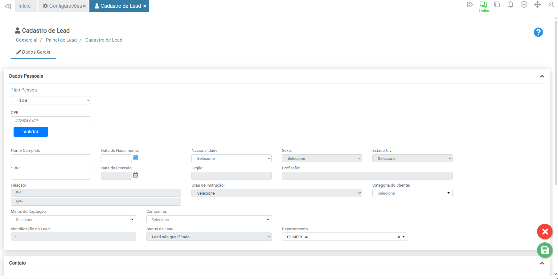 Connect > Comercial > Cadastro de Lead