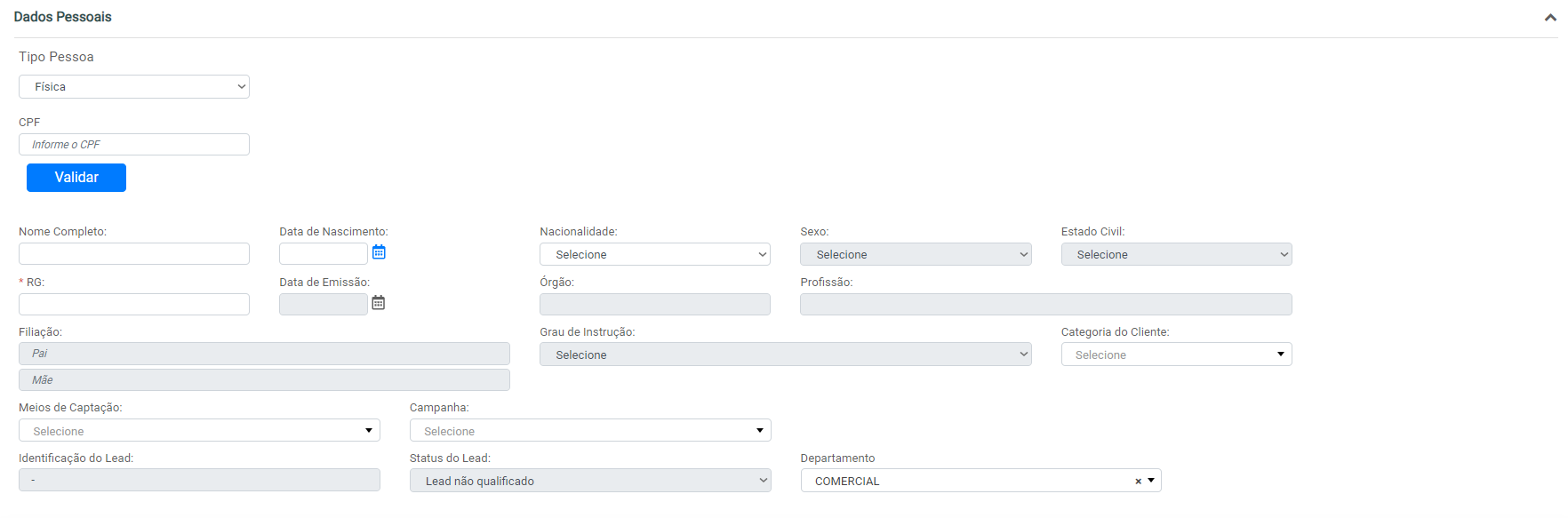O primeiro bloco de informações a serem inseridas para o cadastro de um novo Lead é o de dados pessoais, contemplando os campos exibidos abaixo: