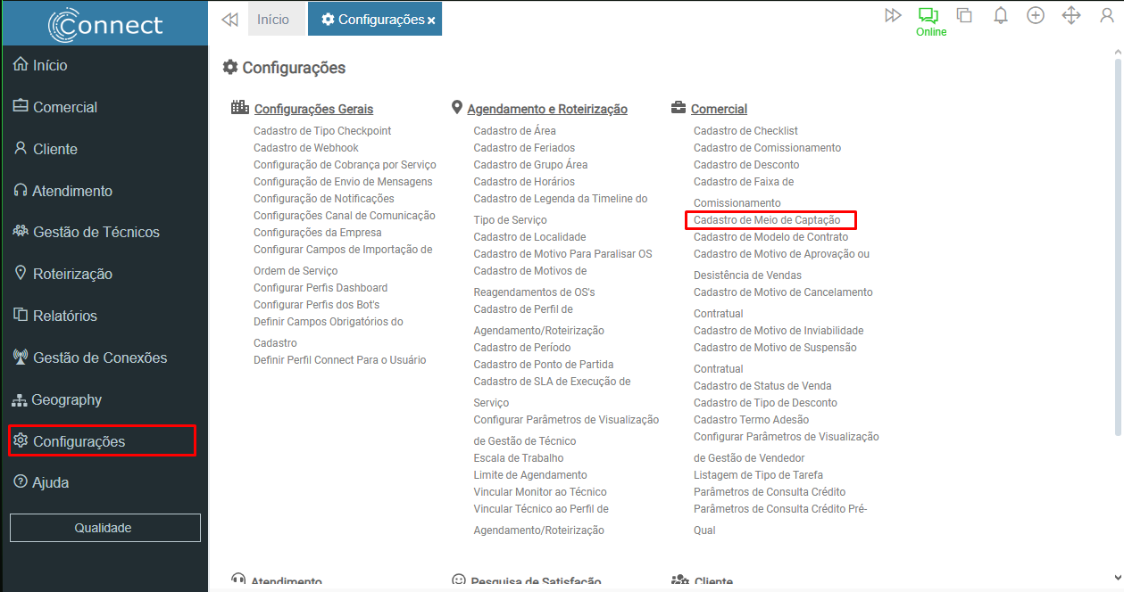 Connect > Configurações > Cadastro de Meio de Captação