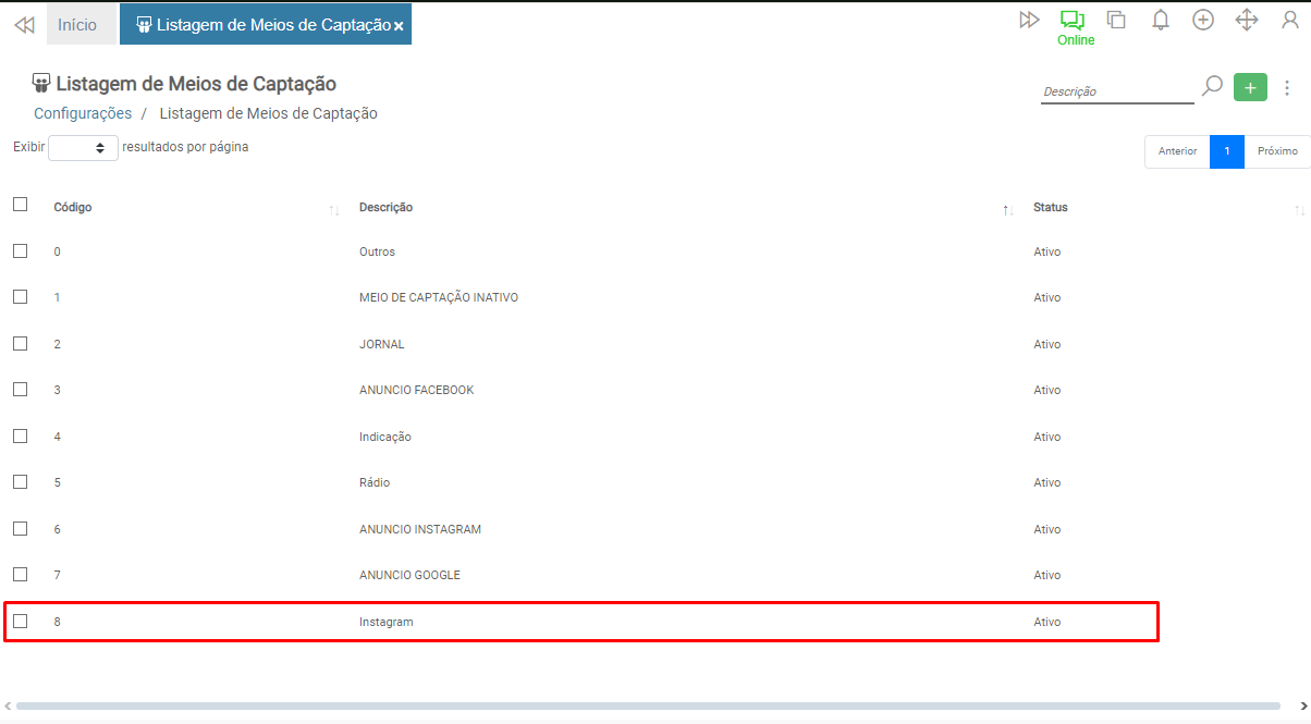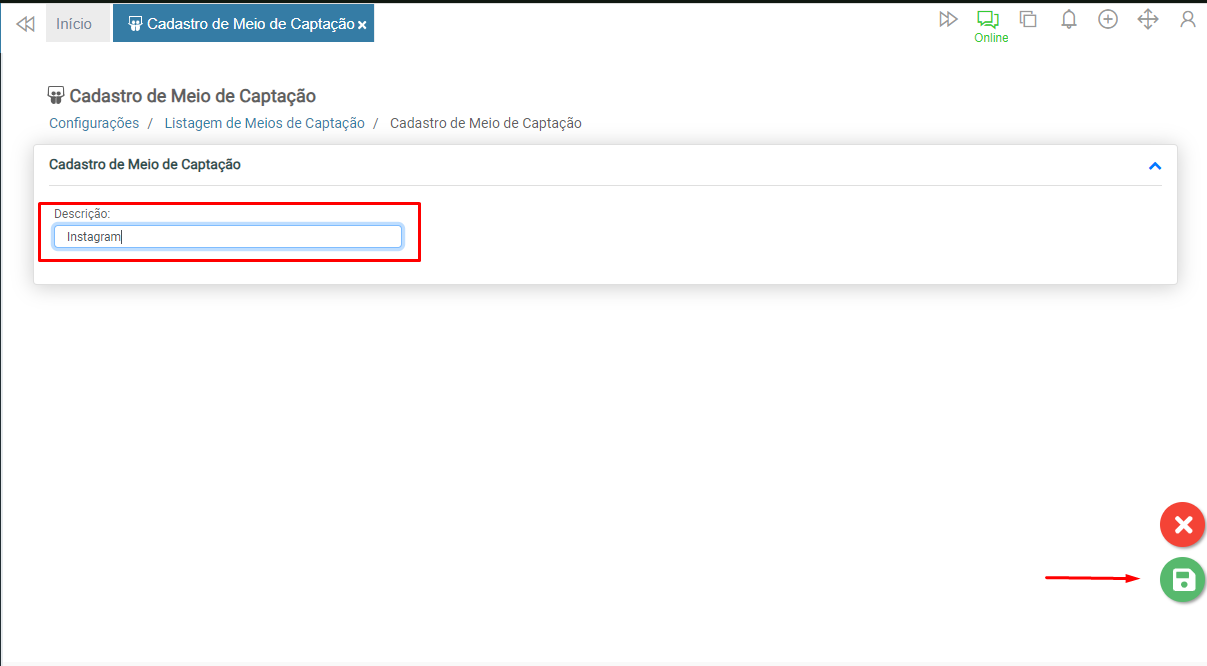 Informe no campo “Descrição” a identificação do meio de captação. Ao concluir, clique em Salvar.