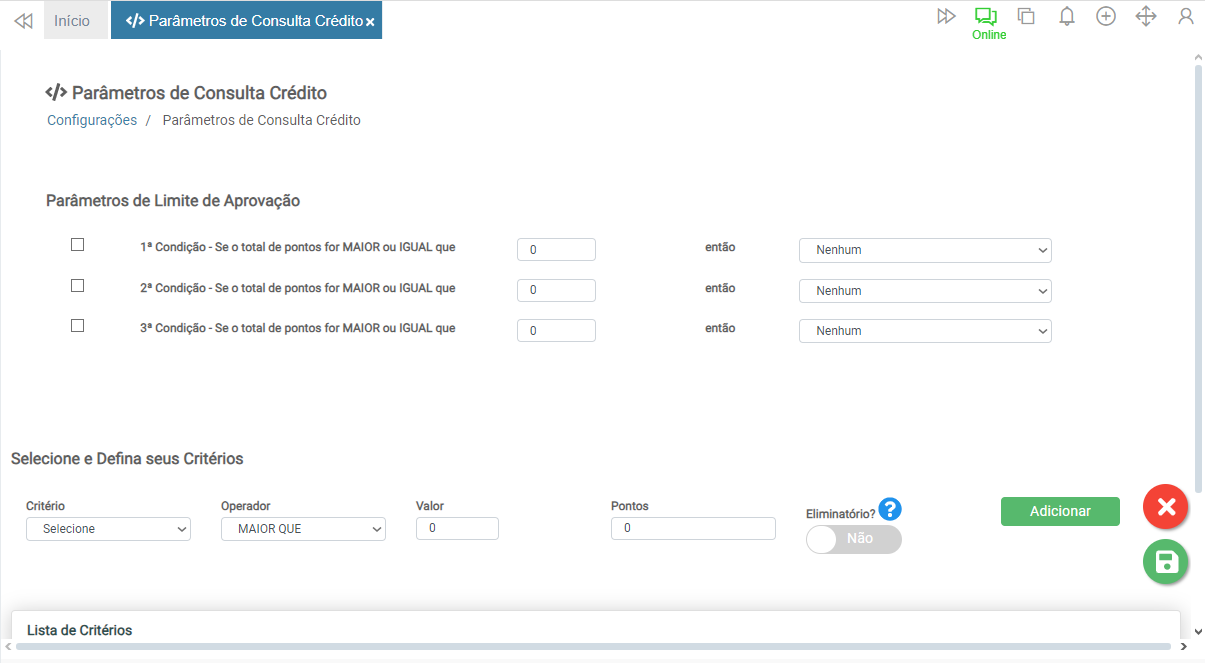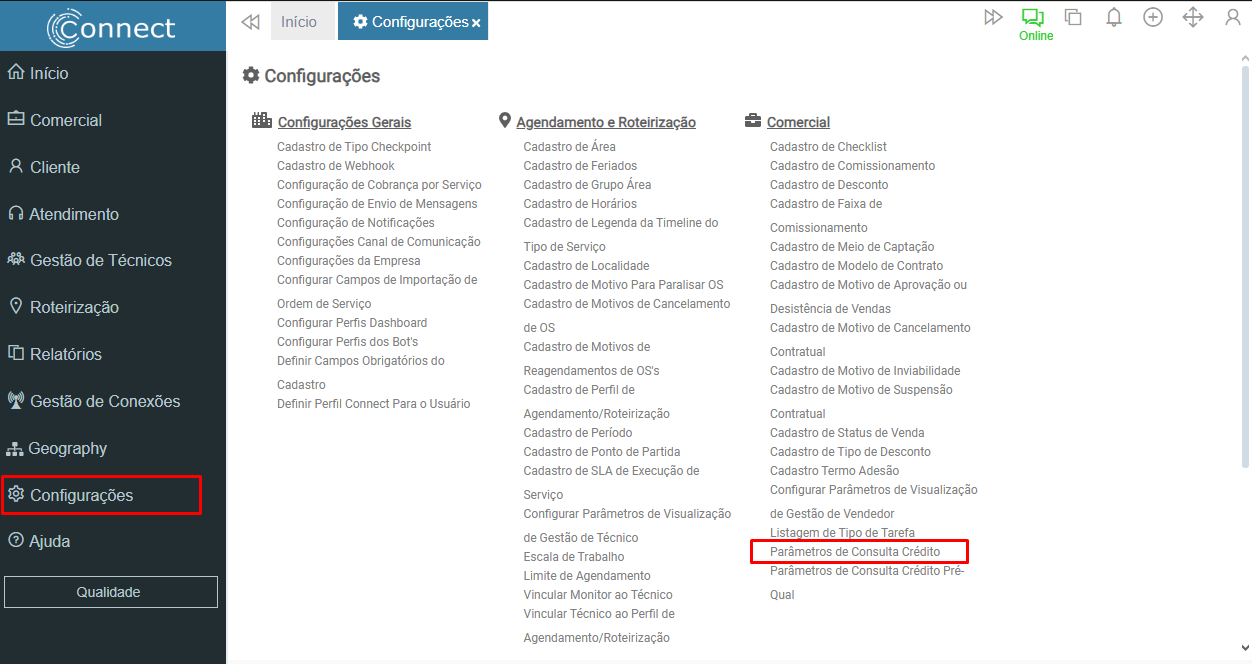 Connect > Configurações > Parâmetros de Consulta Crédito