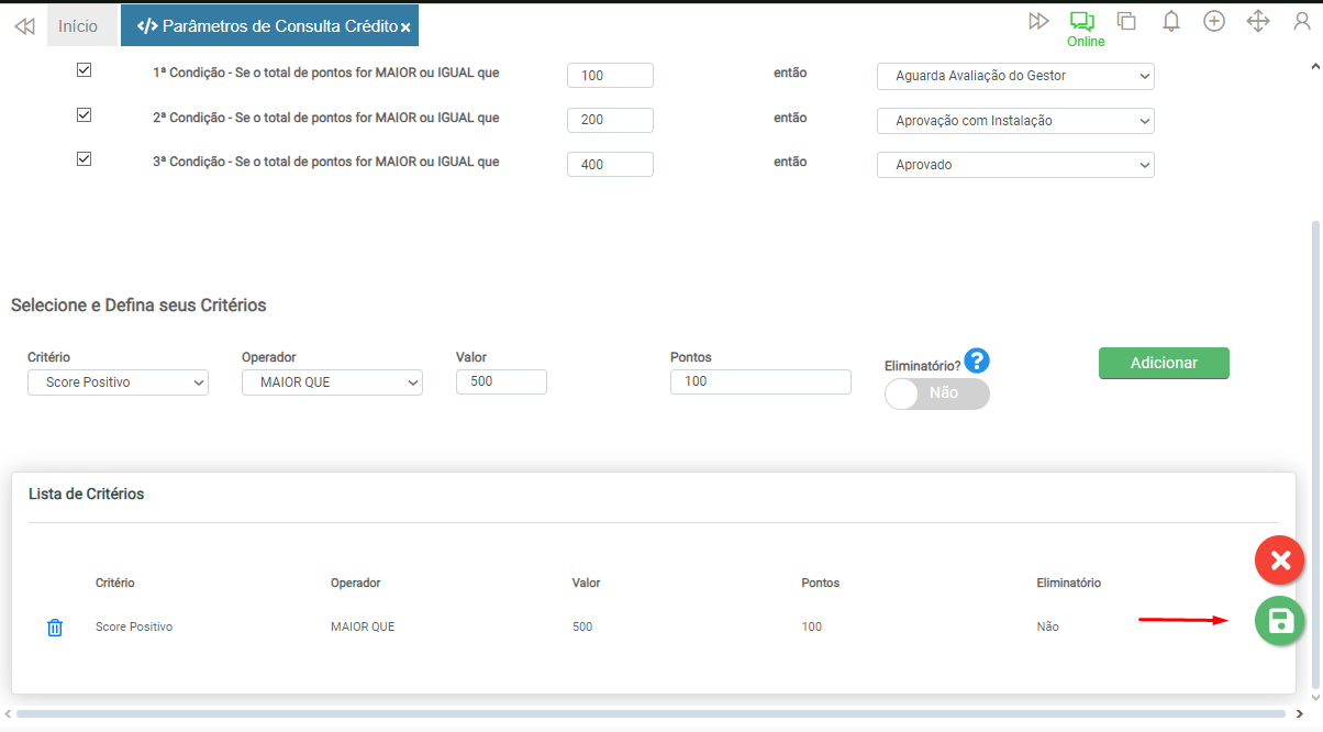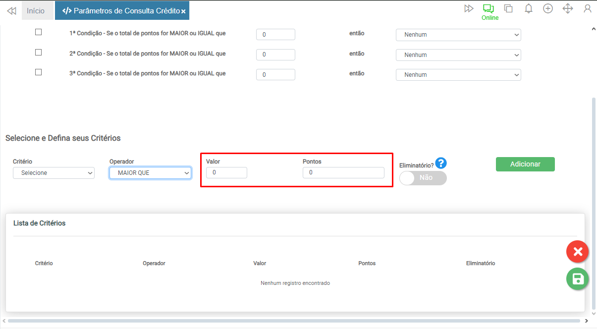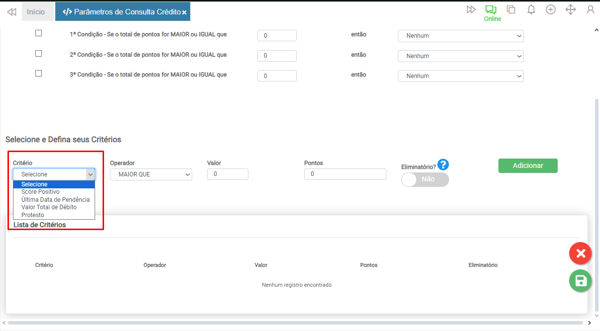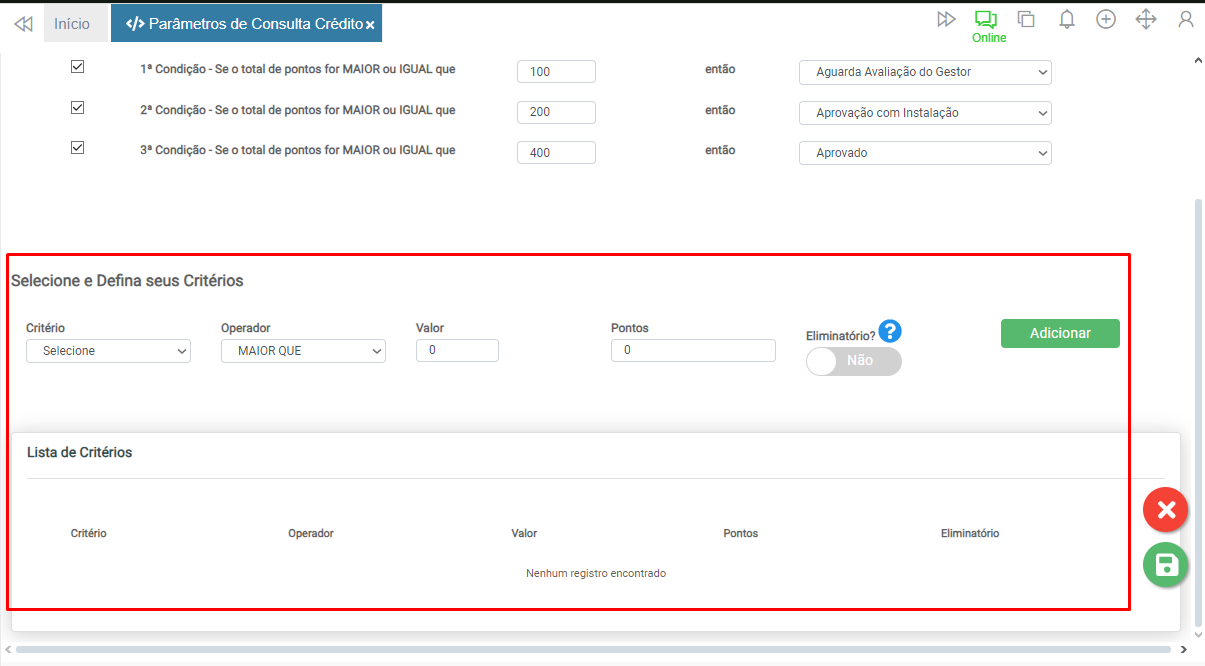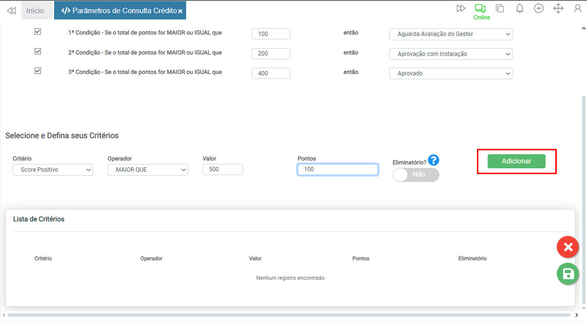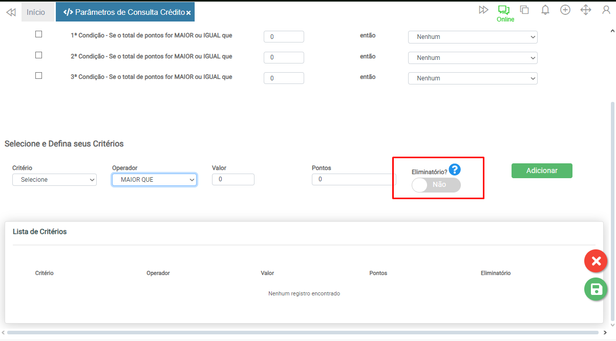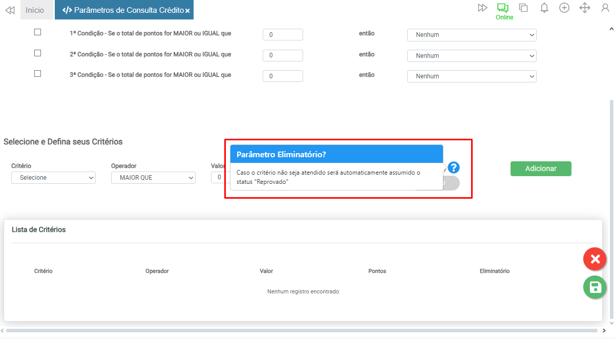 Caso o critério seja impeditivo, ao definir o botão Eliminatório? como Sim, mesmo que os demais critérios sejam atingidos, independentemente da pontuação, a consulta será reprovada.