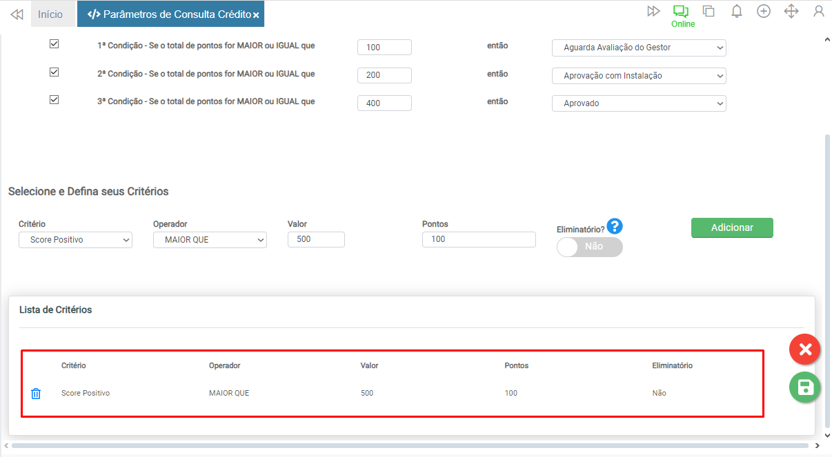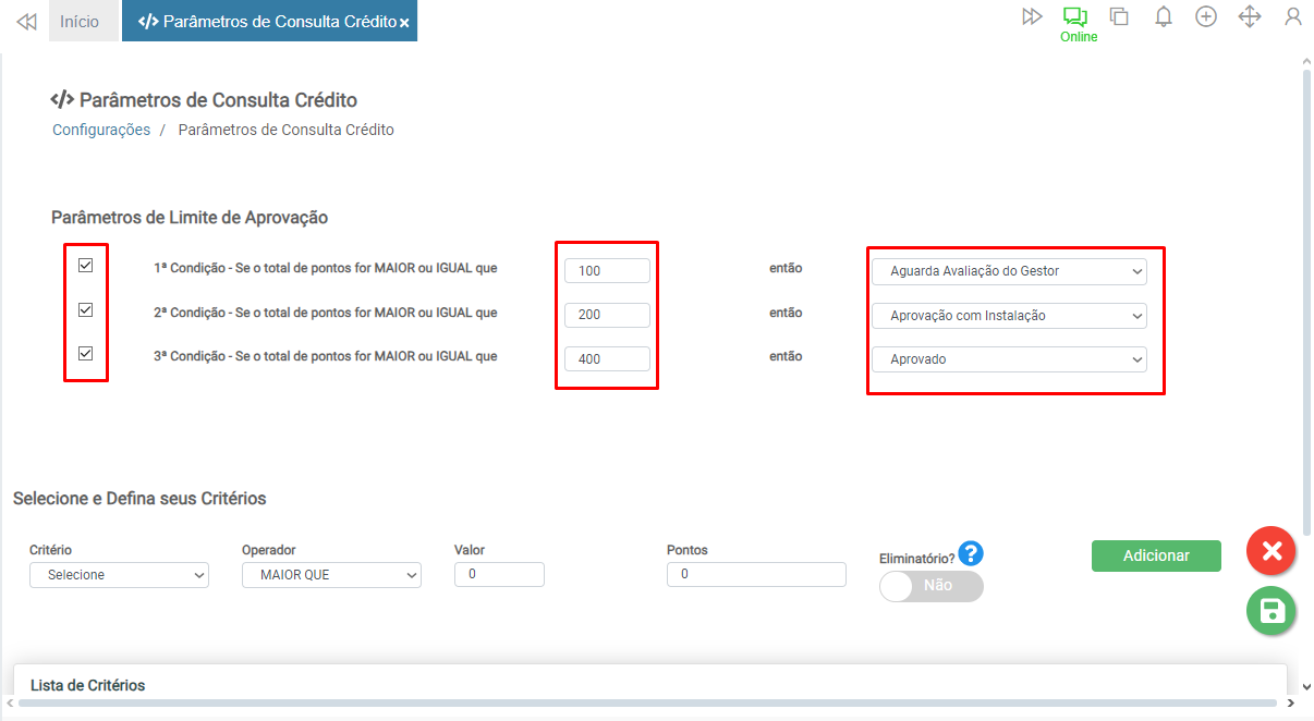Logo abaixo é possível conferir os critérios cadastrados.