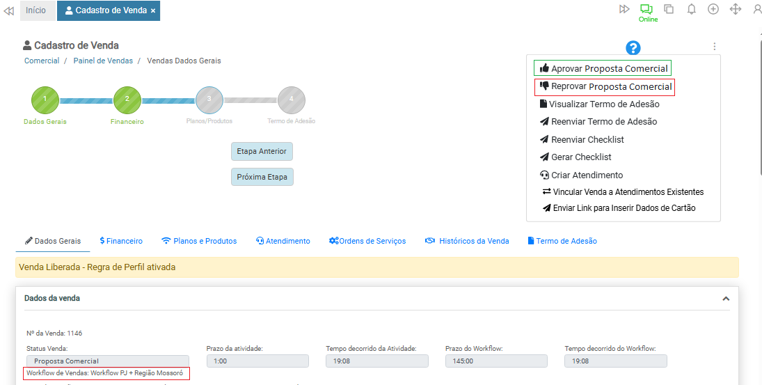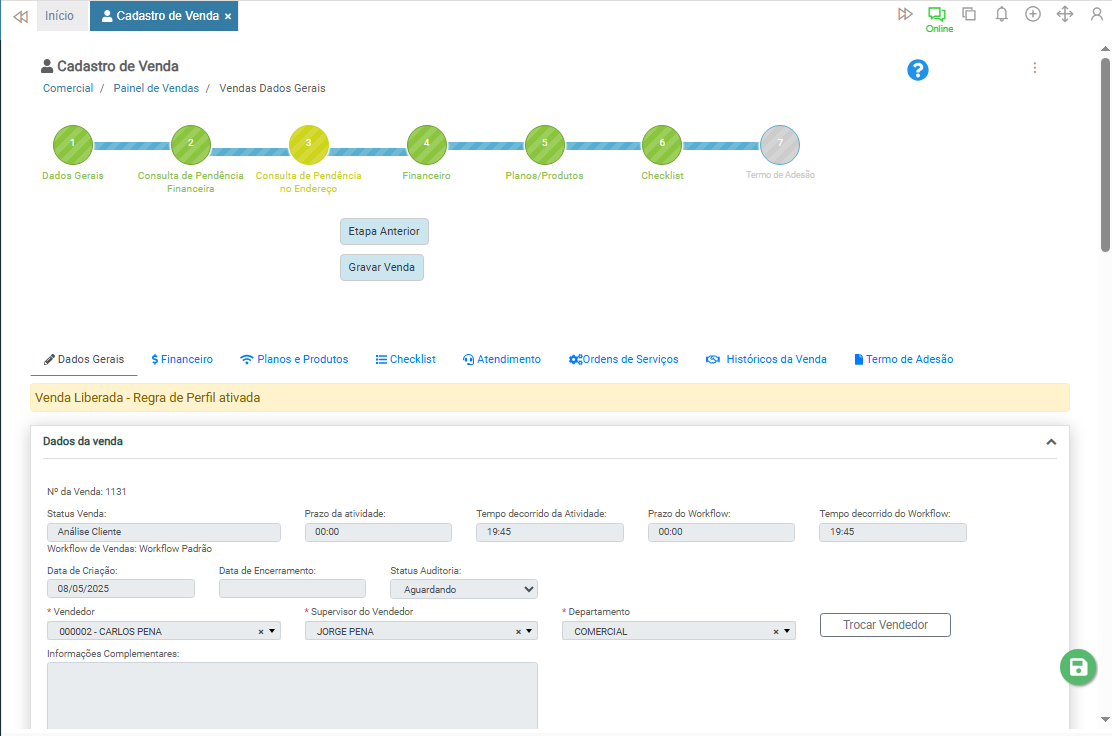 Status Padrão: Indica a situação atual da venda. Pode-se adotar o status padrão do sistema, no entanto, também é possível configurar e utilizar status personalizados, conforme definido nas regras de negócio do provedor, via cadastro de workflow. Caso o workflow possua a característica correspondente à pessoa vinculada à venda, o sistema o atribuirá automaticamente após o registro da etapa inicial;