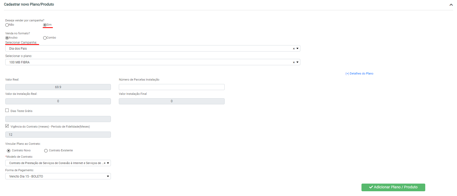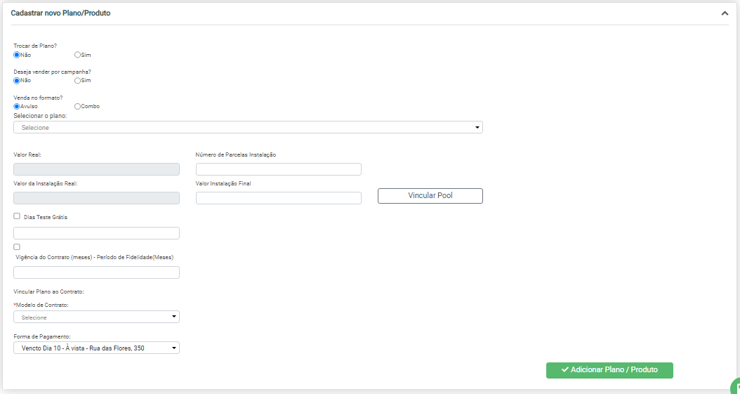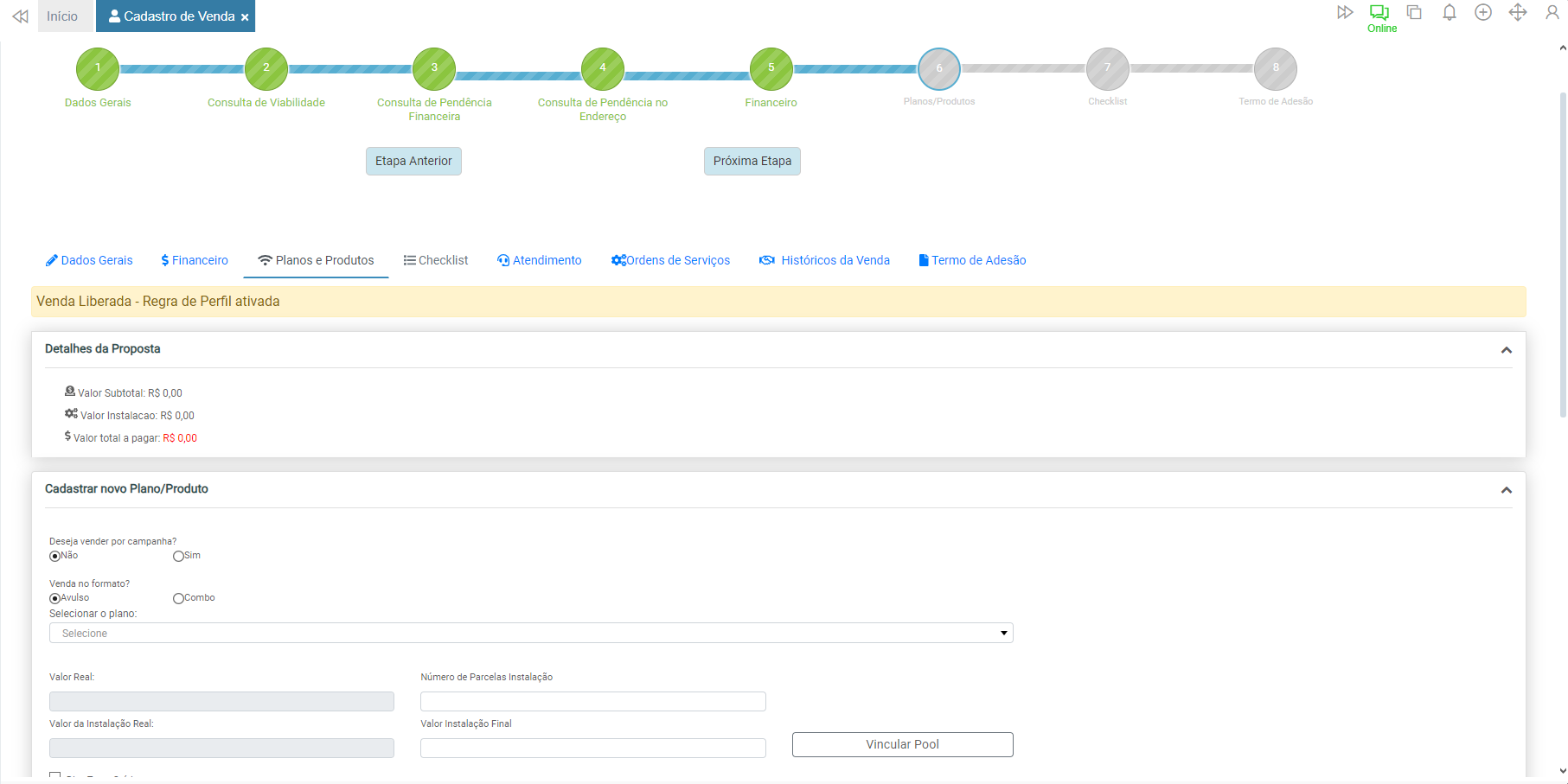 Planos/Produtos: Etapa obrigatória e fixa, destinada à validação dos planos e/ou produtos vinculados à venda, conforme selecionado na aba correspondente;