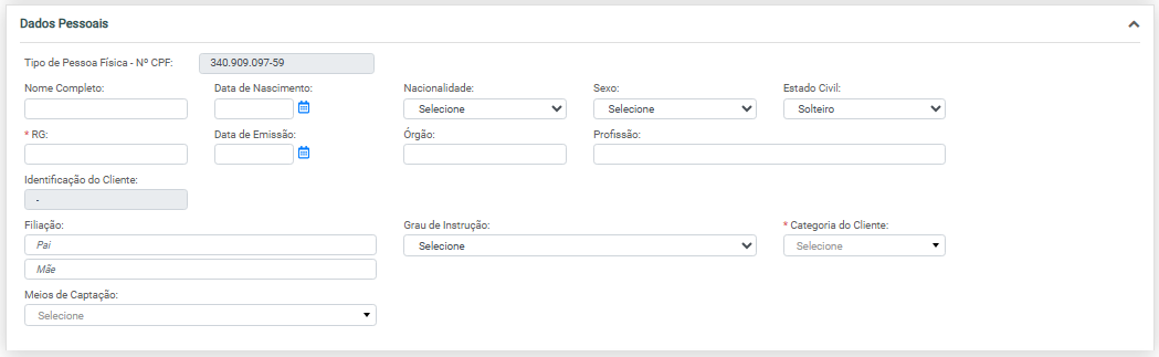 Categoria do Cliente - Campo destinado à seleção da categoria da pessoa física, no qual serão apresentadas todas as categorias cadastradas no Aniel Connect;
