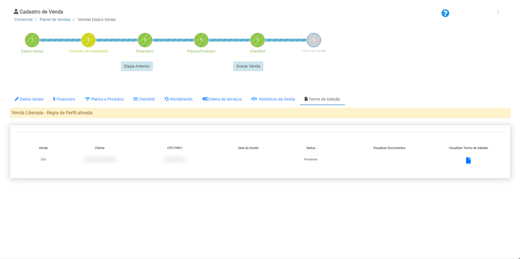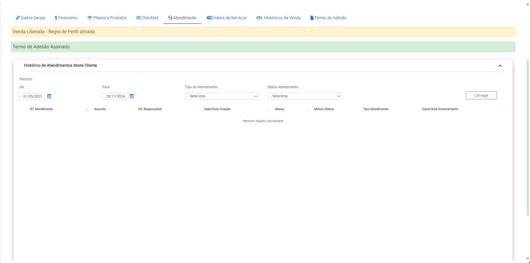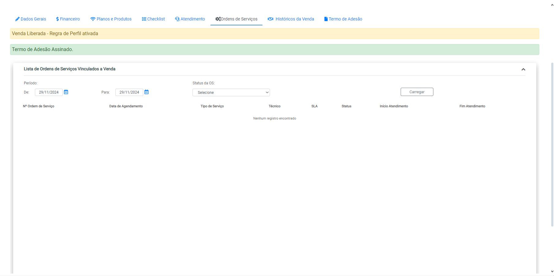 As Ordens de Serviço concentram as demandas técnicas ou operacionais vinculadas à venda, enquanto o Histórico de Vendas apresenta um panorama das negociações anteriores com o cliente, contribuindo para a análise comercial. Por fim, o Termo de Adesão oficializa o aceite do cliente às condições da venda, funcionando como um documento de validação contratual.