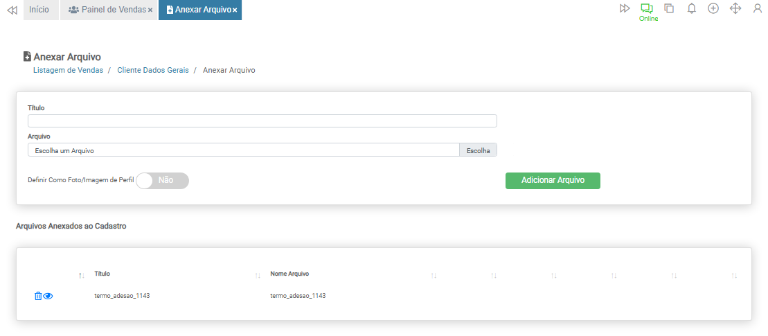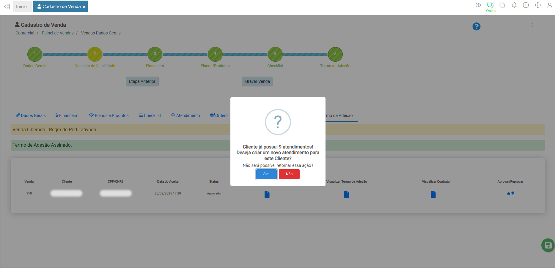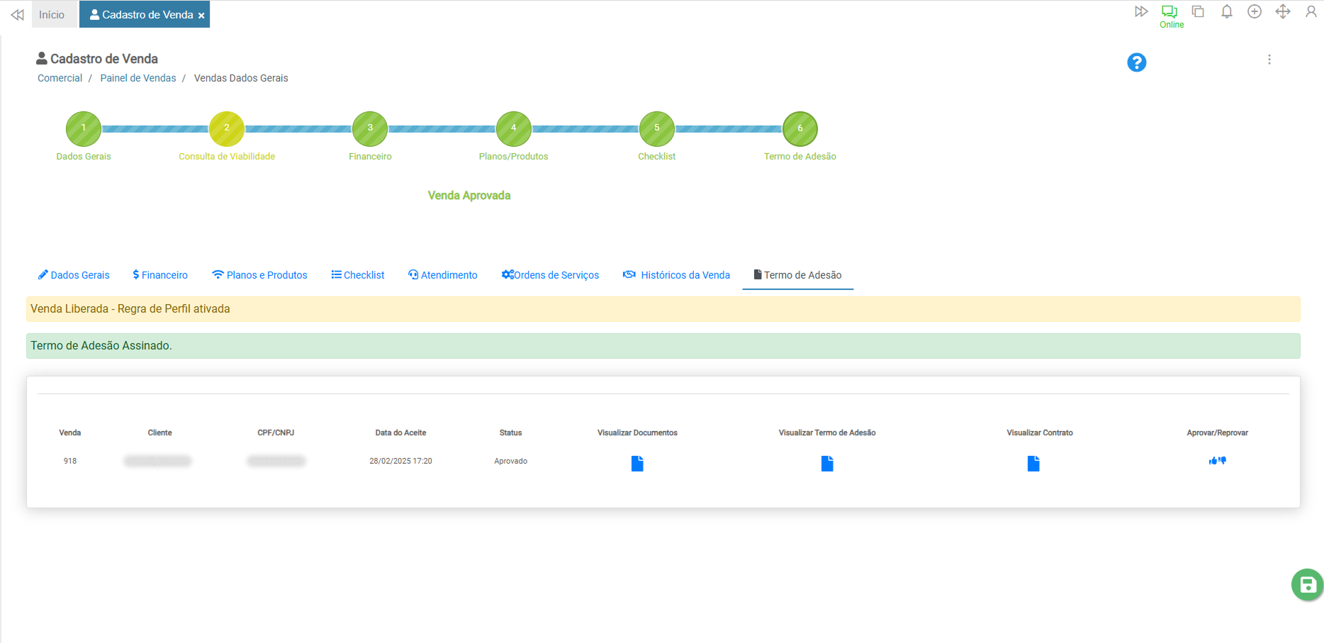 As Ordens de Serviço concentram as demandas técnicas ou operacionais vinculadas à venda, enquanto o Histórico de Vendas apresenta um panorama das negociações anteriores com o cliente, contribuindo para a análise comercial. Por fim, o Termo de Adesão oficializa o aceite do cliente às condições da venda, funcionando como um documento de validação contratual.