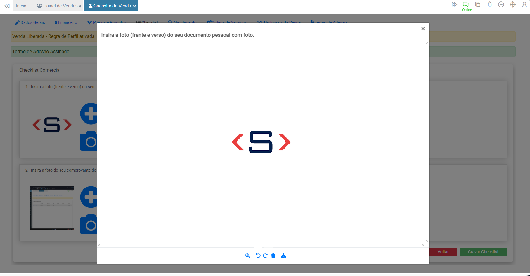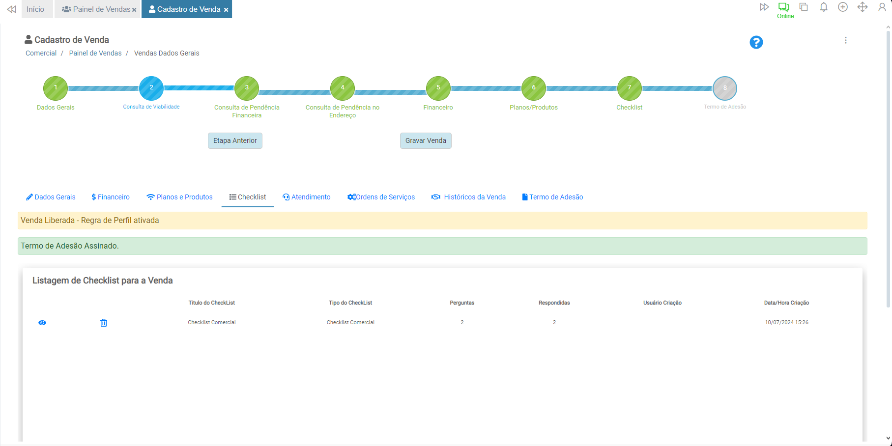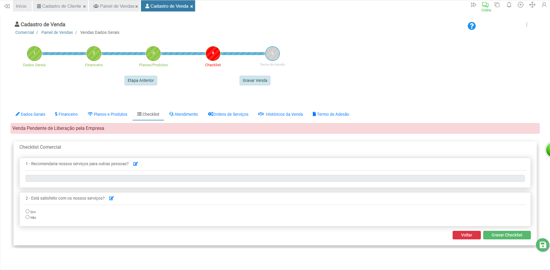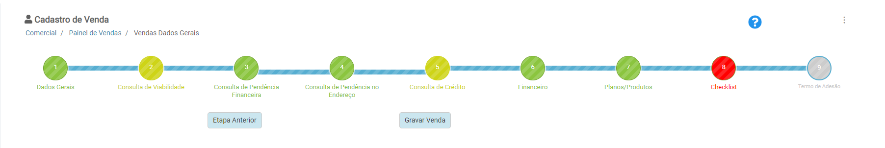 Checklist: Esta etapa será exibida apenas se existir um checklist previamente cadastrado no sistema que se aplique à venda em questão. Caso aplicável, seu preenchimento será obrigatório para a aprovação da venda. Se não houver checklist correspondente, a etapa será ocultada automaticamente;