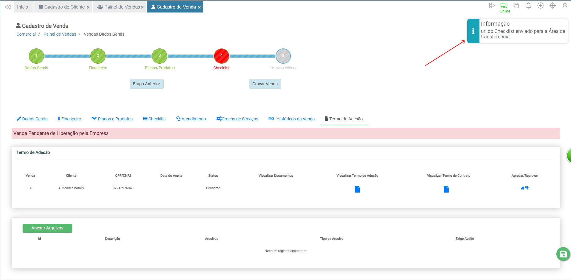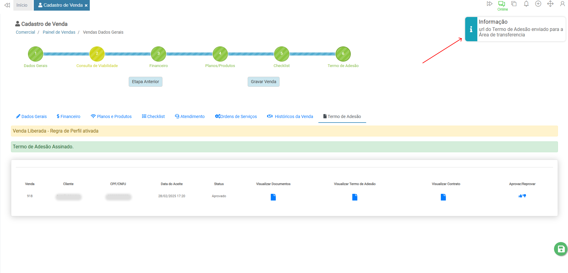 Ao selecionar a ação de Copiar Link do Termo de Adesão, o sistema irá copiar o link que redireciona para a documentação do aceite do termo de adesão. O usuário poderá colar a URL que foi enviada para área de transferência, em uma nova aba do navegador, e terá acesso ao aceite da venda.