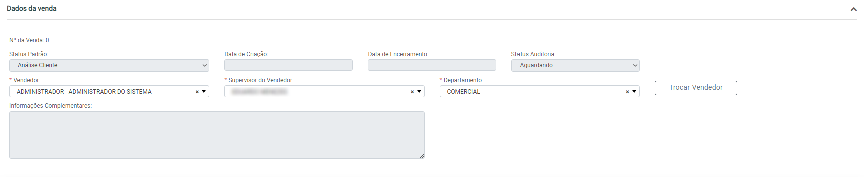 Nota: Somente três campos dos dados da venda poderão ser alterados: Vendedor, Supervisor e Departamento. Para realizar alterações, é necessário possuir acesso à área "Alterar Vendedor/Supervisor". Nesses casos, o botão “Trocar Vendedor” será exibido.