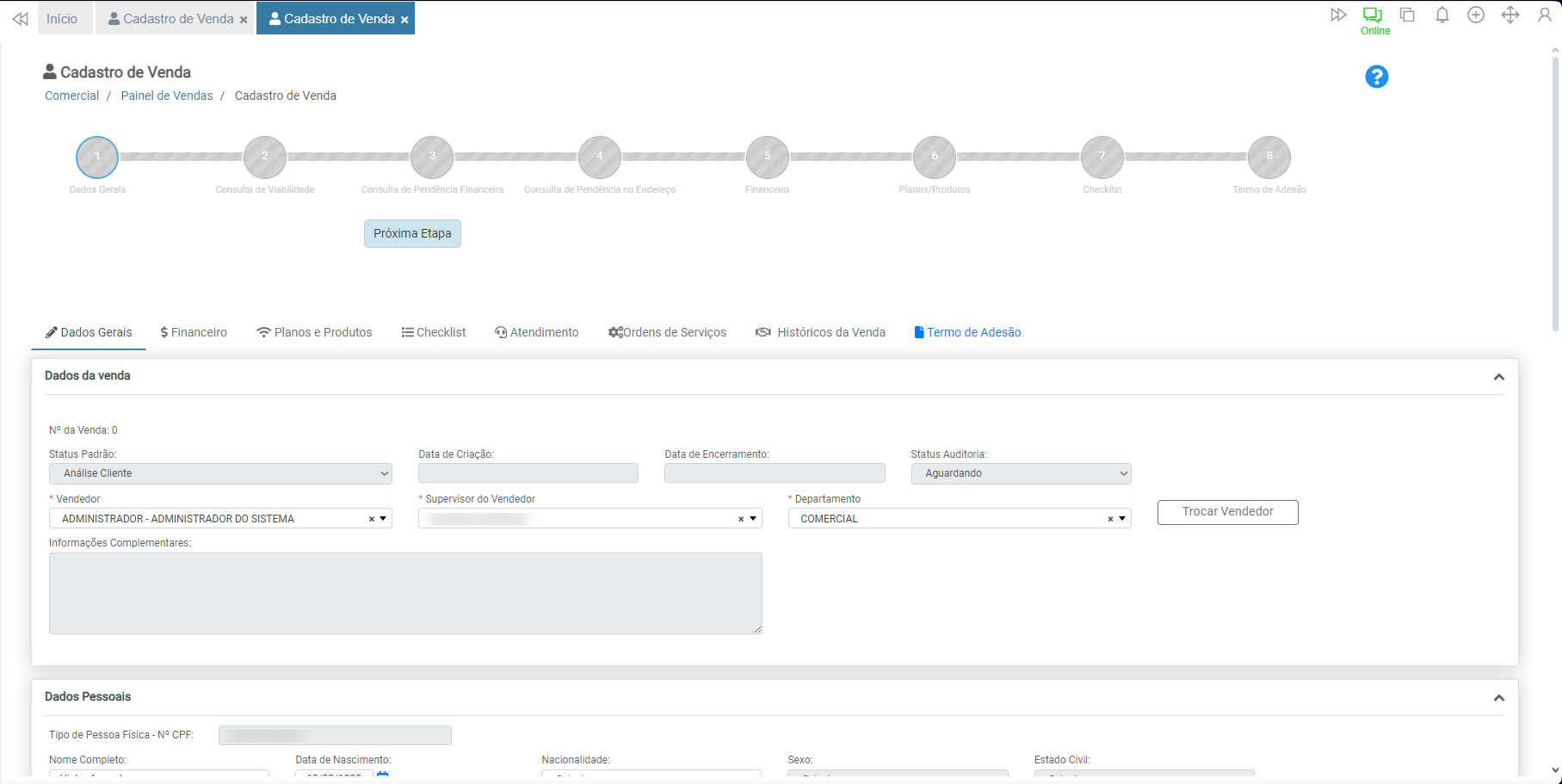 Dados Gerais: Esta etapa é obrigatória e não pode ser ocultada. Nela, devem ser inseridas as informações básicas referentes à venda, como dados da venda, dados pessoais do cliente e endereço, localizadas na aba "Dados Gerais";