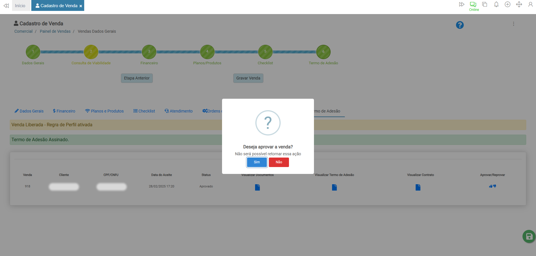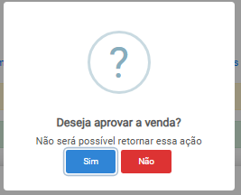 Essa ação estará disponível após todas as validações das etapas anteriores do fluxo do cadastro de venda terem sido realizadas. Ao clicar em Aprovar Venda, e selecionar SIM, usuário irá autorizar e liberar a venda para seguir para a próxima fase do processo. Ao selecionar NÃO, usuário manterá a venda em aberto.