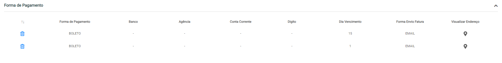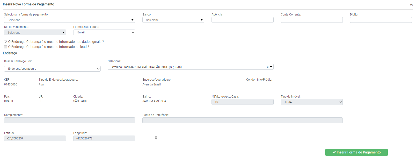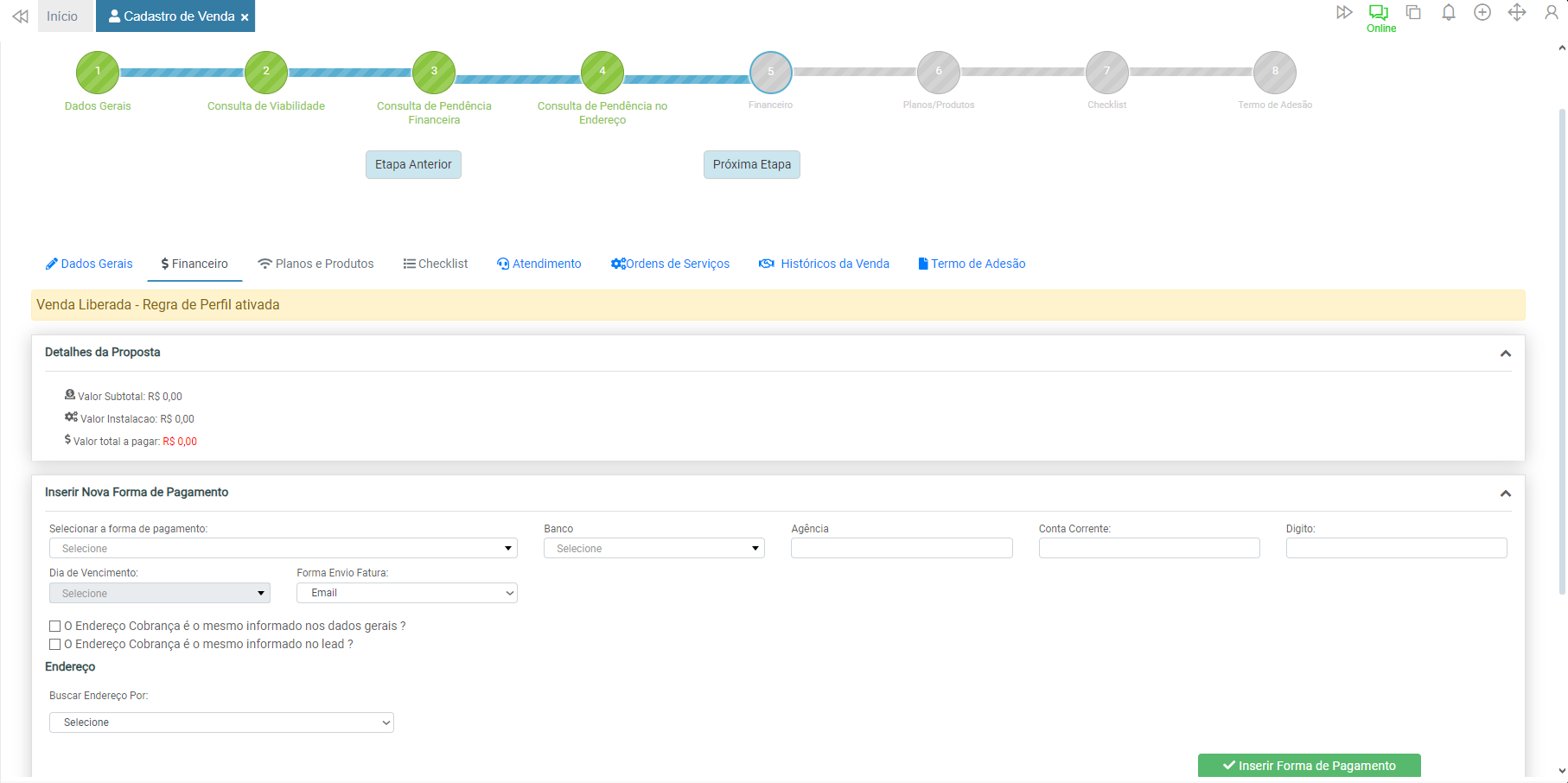 Financeiro: Esta etapa também é obrigatória e não pode ser ocultada. Nela, são inseridas as informações relacionadas à forma de pagamento, bem como os planos ou produtos adquiridos, com seus respectivos métodos de cobrança (boletos, faturas, entre outros);
