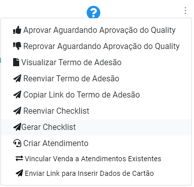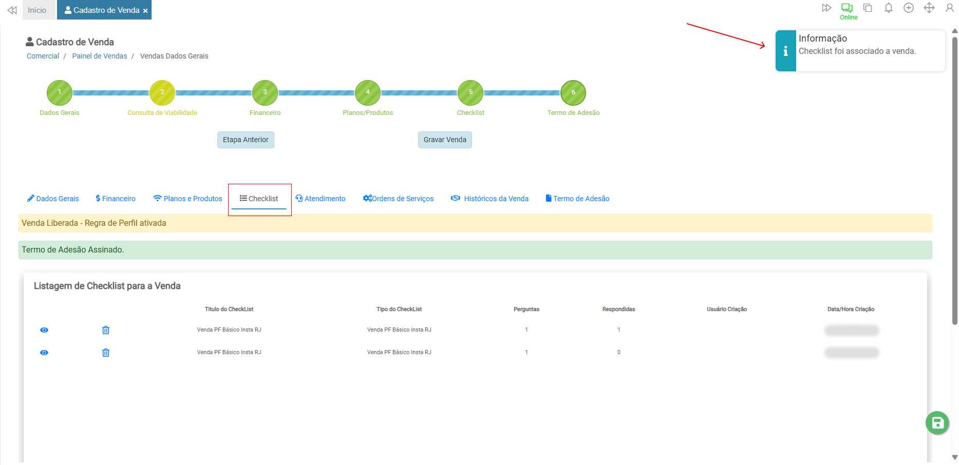 Ao clicar em Gerar Checklist, essa ação irá gerar um novo checklist que será vinculado à venda, considerando as regras de filtro e configurações aplicadas.