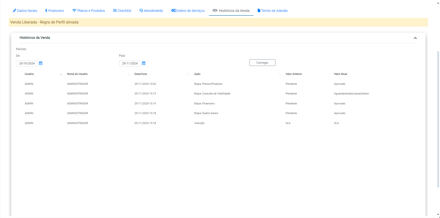 A aba Históricos da Venda tem como objetivo registrar e exibir todas as ações executadas ao longo do ciclo de vida de uma venda, permitindo o acompanhamento detalhado das alterações realizadas. Entre os registros contemplados, incluem-se ações como aprovação ou reprovação de etapas, modificação de status da venda (por exemplo, de “Em Análise” para “Cancelado”), entre outras interações relevantes.