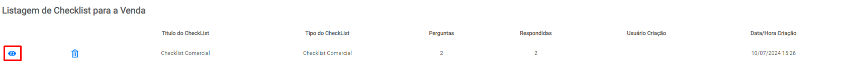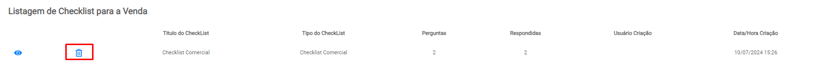 Caso seja necessário remover o checklist atual, o usuário poderá utilizar o ícone de lixeira, localizado na mesma tela de visualização: