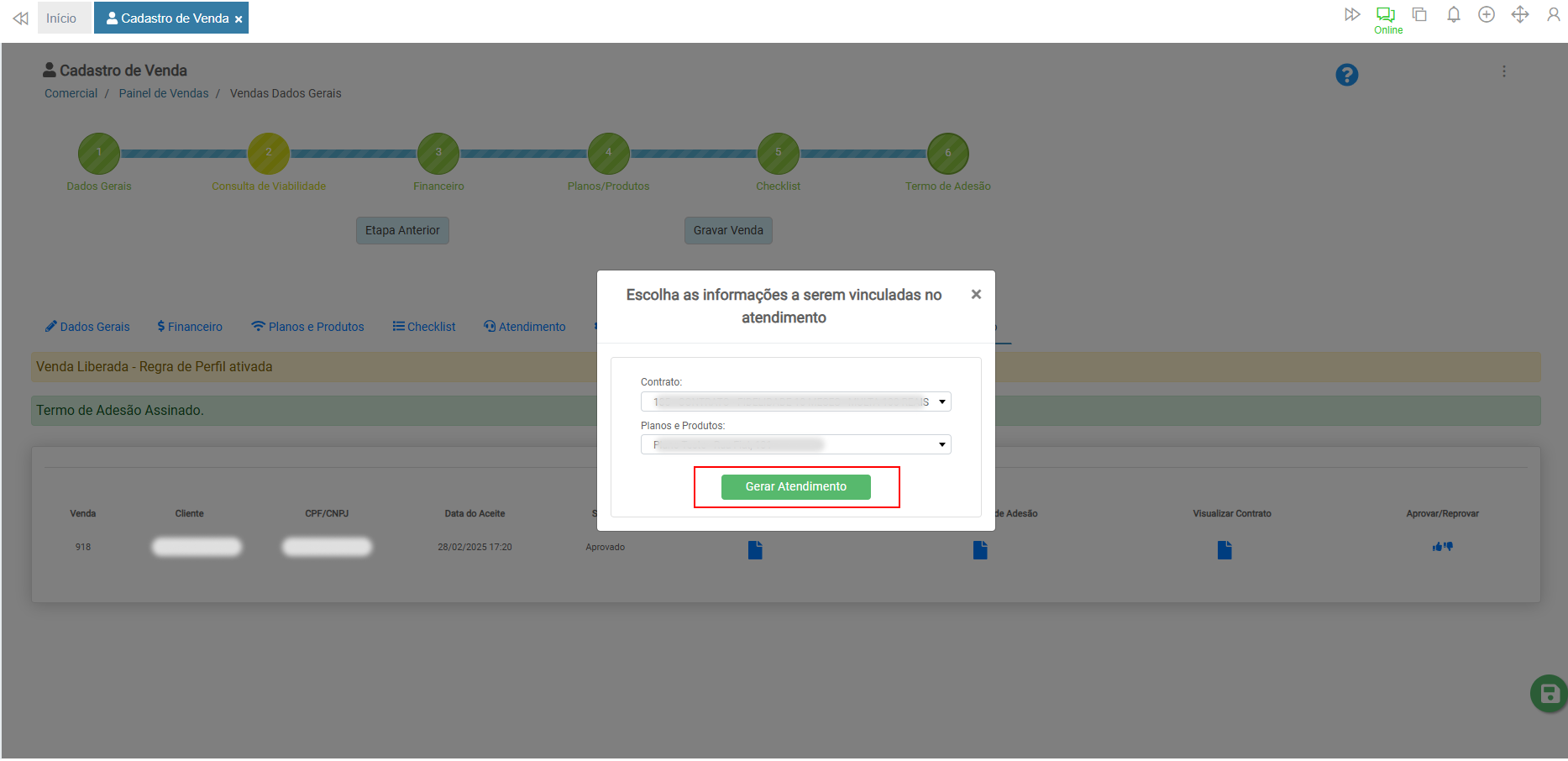 Ao clicar em Criar Atendimento, e selecionar SIM na modal, será será aberto um novo protocolo de atendimento para o cadastro da venda. O usuário deverá escolher as informações de Contrato e Planos e Produtos a serem vinculadas no atendimento. Ao selecionar NÃO, a modal se fechará.