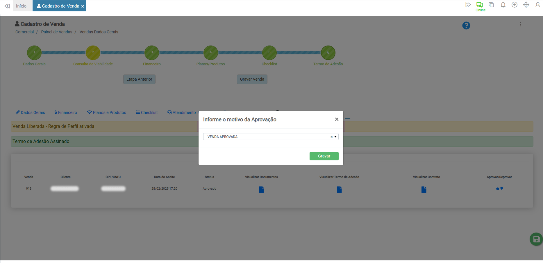 Após a aprovação, o sistema bloqueará todos os campos da venda, impedindo qualquer edição, como alteração de vendedor, anexos de documentos, entre outros. A venda passará a ser apenas consultável.