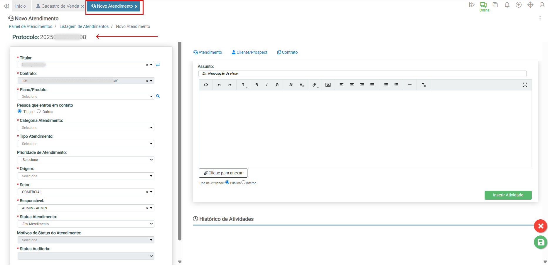 A Aba Atendimento exibe uma lista com todos os atendimentos realizados para o cliente, permitindo consulta detalhada e acompanhamento do status.