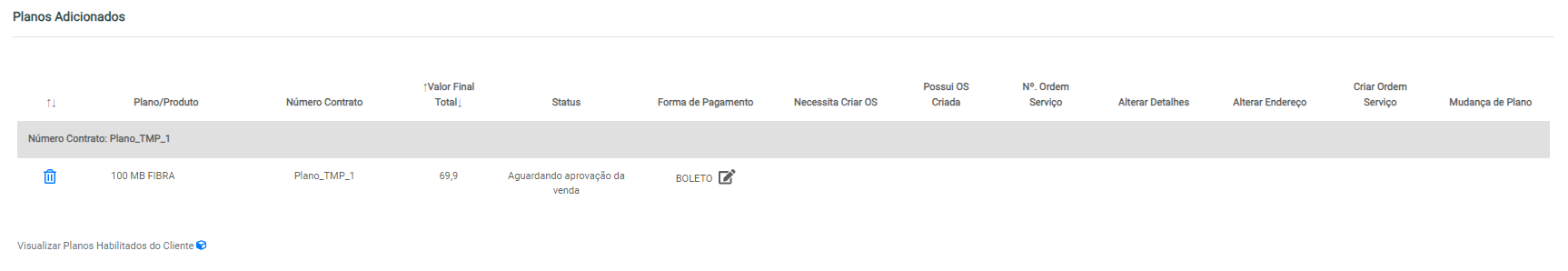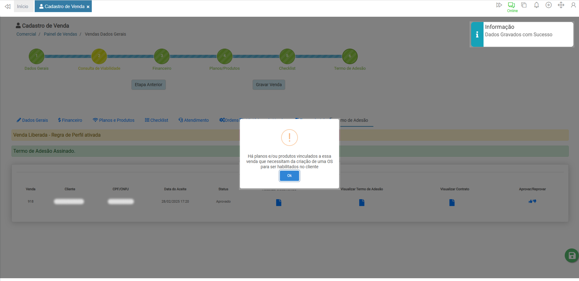 Criação de OS: A etapa "Criação de OS" será incluída automaticamente sempre que for adicionado à venda ao menos um plano ou produto que exija a geração de Ordem de Serviço (OS). Essa etapa, no entanto, só será ativada após a aprovação da venda. Uma vez aprovada a venda: