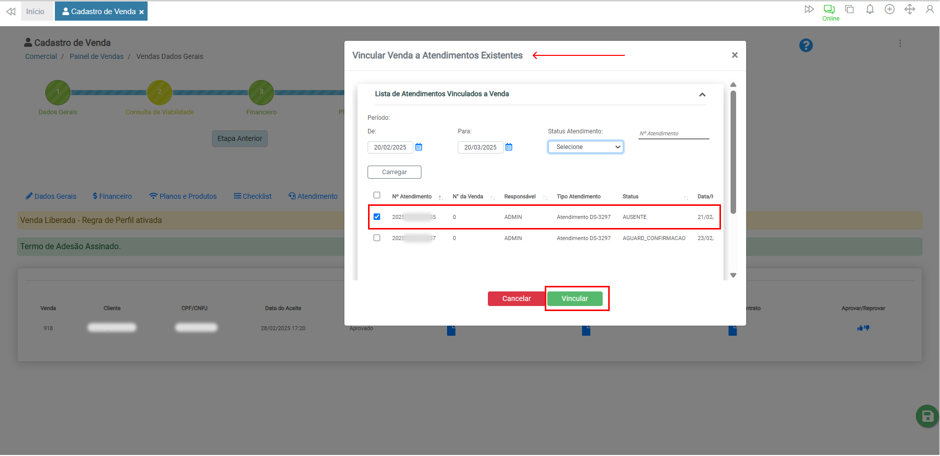 Ao clicar na ação Vincular Venda a Atendimento Existente, será aberta uma modal exibindo atendimentos existentes no sistema que poderão ser vinculados a venda.