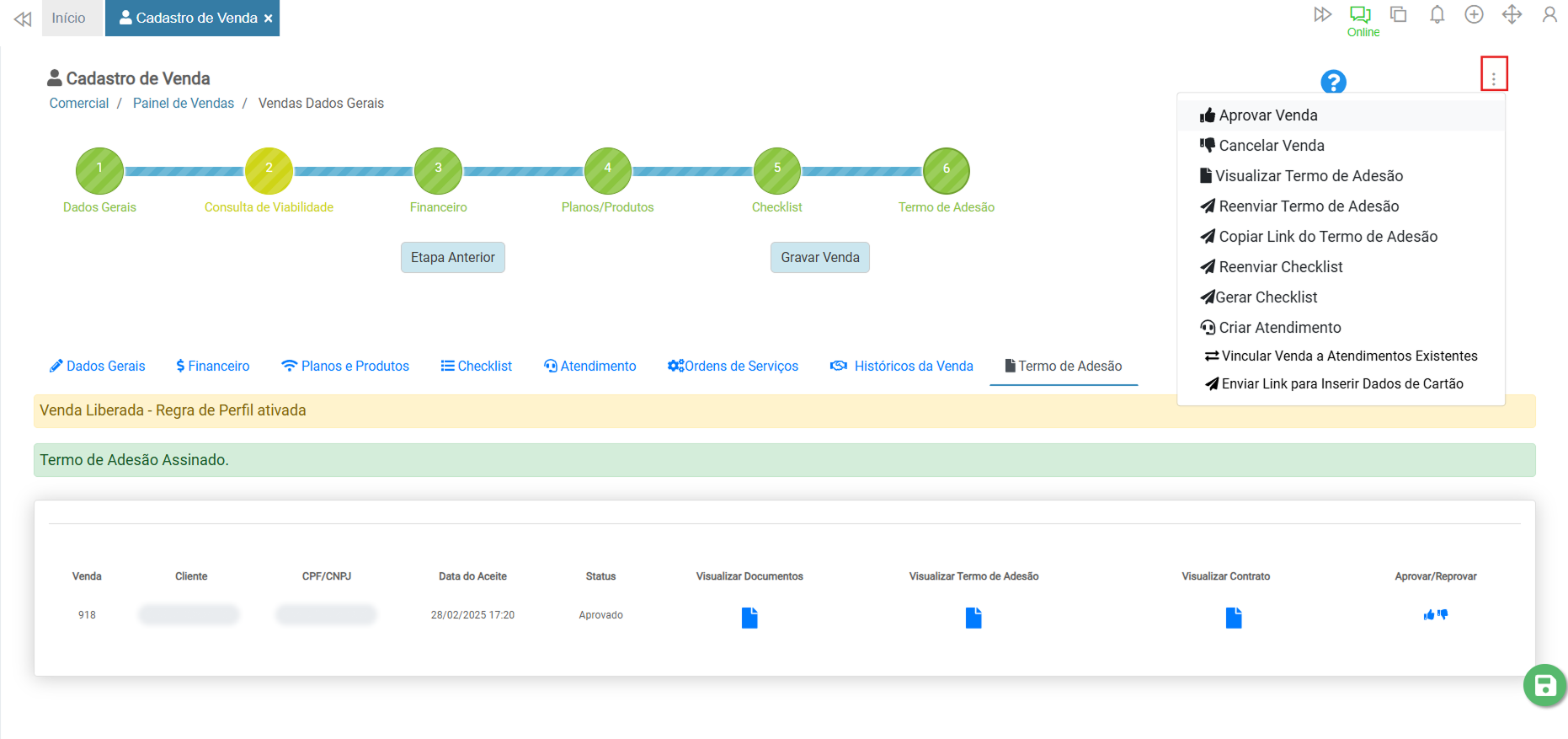 Termo de Adesão: Responsável por validar o aceite do termo de adesão e/ou contrato. Esta etapa será obrigatória apenas se a configuração "Exige aceite ao termo de adesão para conclusão de venda?" estiver ativada no módulo Configurações Comercial / Financeiro. Caso contrário, a venda poderá ser aprovada mesmo sem o aceite formal.