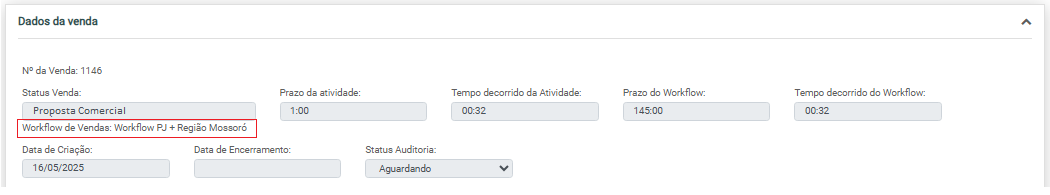 Tempo decorrido do Workflow: Aponta o tempo total já transcorrido do workflow. Este campo será exibido somente se houver workflow vinculado após o registro da primeira etapa da venda;