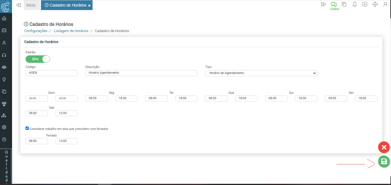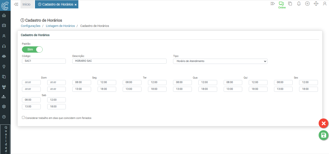 Obs.: Caso o atendimento seja disponível em feriados, é necessário marcar o checkbox "Considerar trabalho em dias que coincidem com feriados" e definir o horário para os feriados.