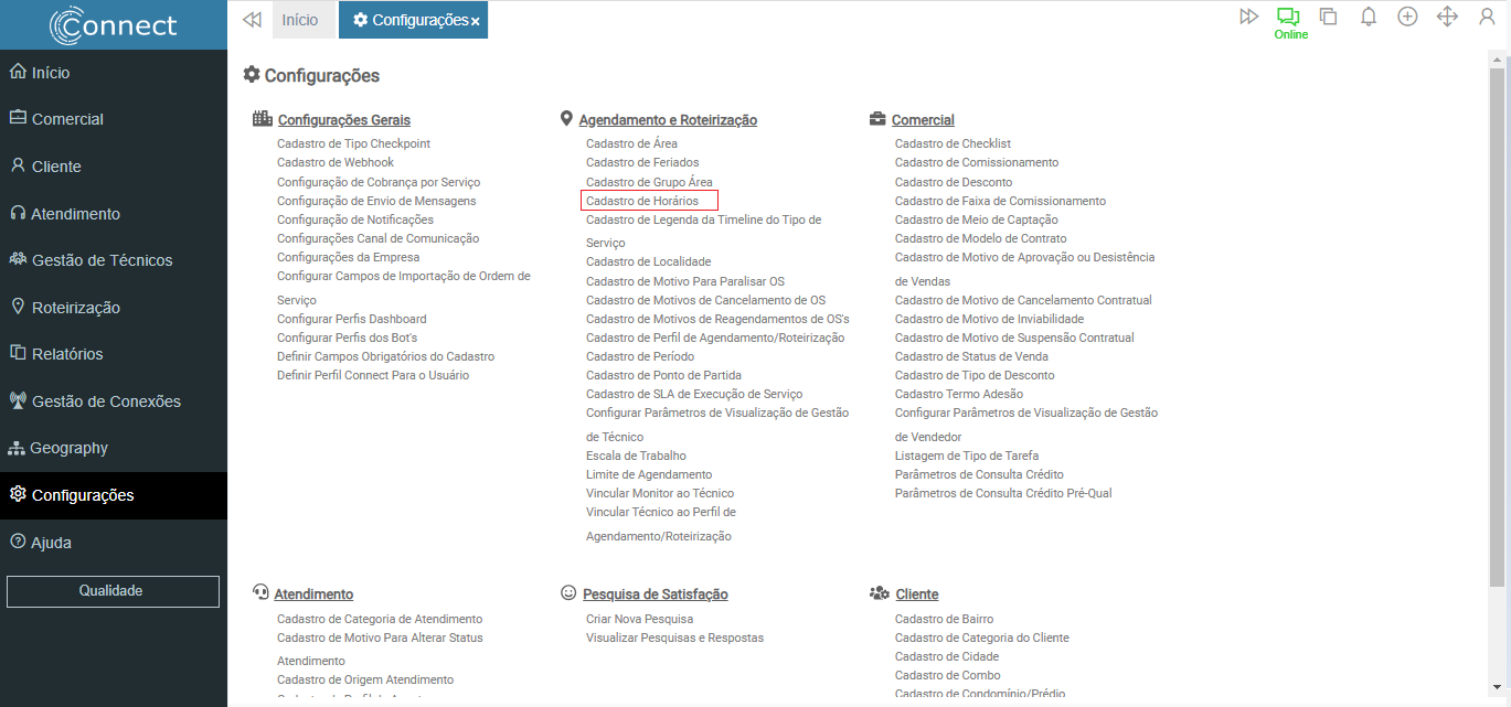 Connect > Configurações > Cadastro de Horários
