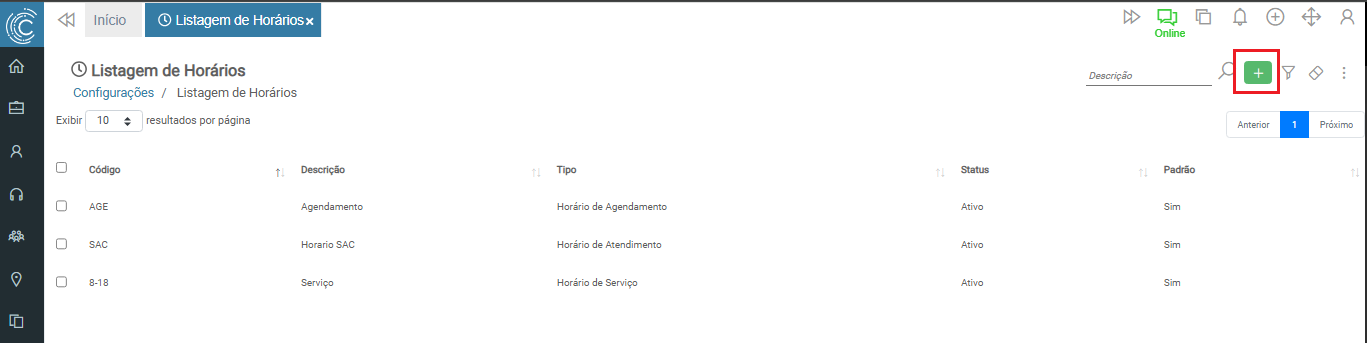 Obs.: Ao utilizar os horários de Agendamento e Serviço, é necessário definir um deles como “Padrão” para que o sistema mantenha a referência correta que deve ser coletada em rotinas padrões.