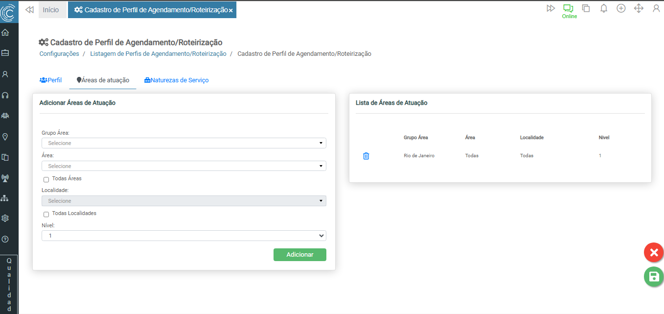 Deverá ser preenchido com a estrutura de Grupo Área, Área e Localidade, para indicar as áreas de atendimento que poderão ser atribuídas para técnicos amarrados a este perfil. É necessário, no bloco esquerdo, selecionar os registros e clicar sobre “Adicionar” para vincular as regiões pretendidas ao lado direito (Lista de Áreas de Atuação):