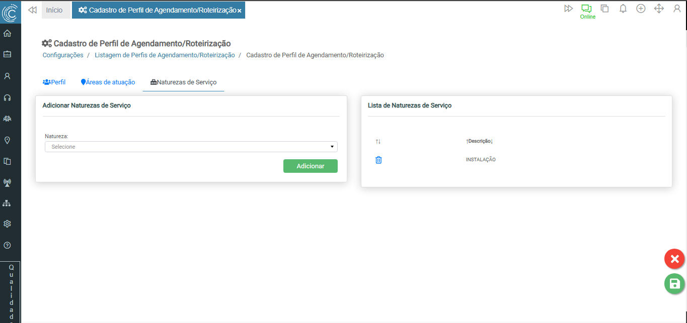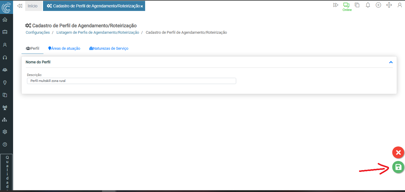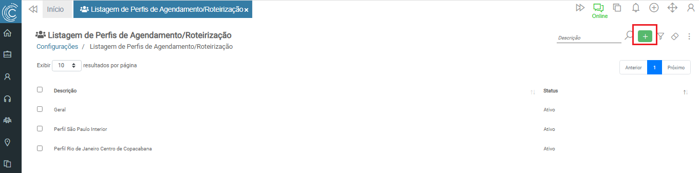 O Cadastro de Perfil de Agendamento/Roteirização é utilizado para definir e agrupar regras de roteirização e agendamento, definindo as áreas de atuação e habilidades. Para cadastrar um novo perfil, clique no botão incluir.