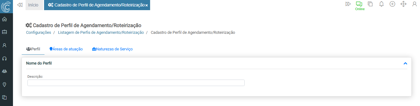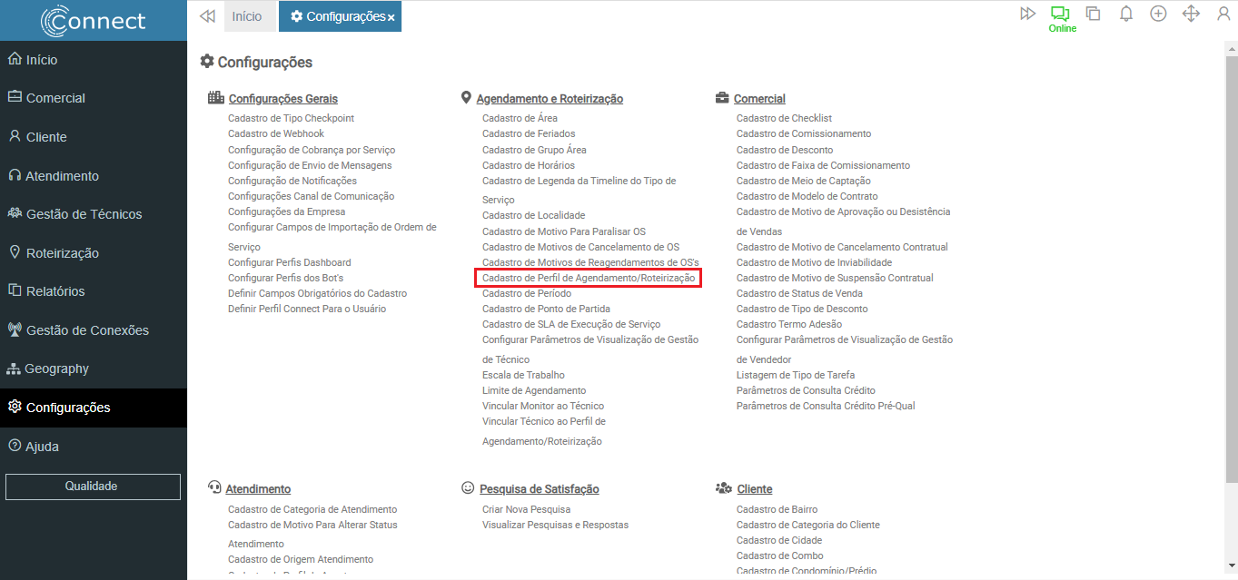Connect > Configurações > Cadastro de Perfil de Agendamento/Roteirização