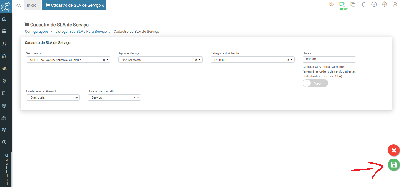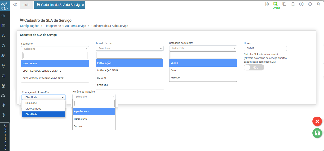 Calcular SLA Retroativamente? Este campo é responsável por aplicar ou não o prazo definido para Ordens de Serviço já criadas previamente. Marcando como “sim”, realizará o processo citado, caso seja marcado como “não”, somente novos registros considerarão o SLA configurado. Este comportamento se aplica com a mesma lógica para edição do registro.