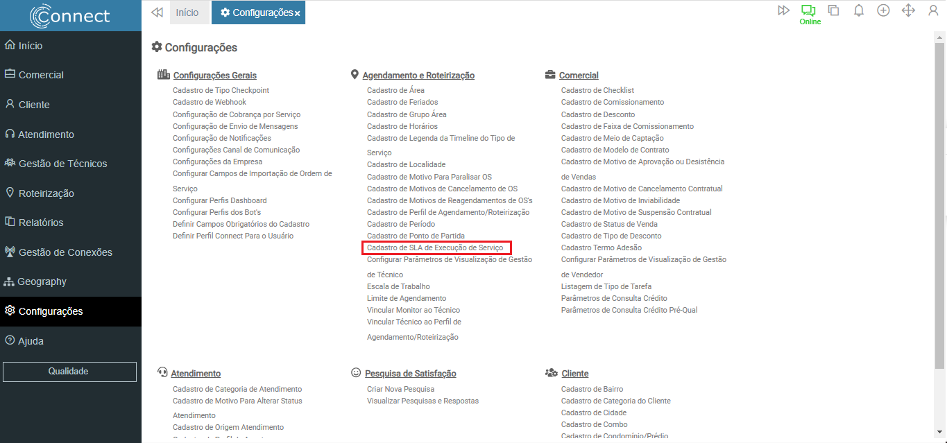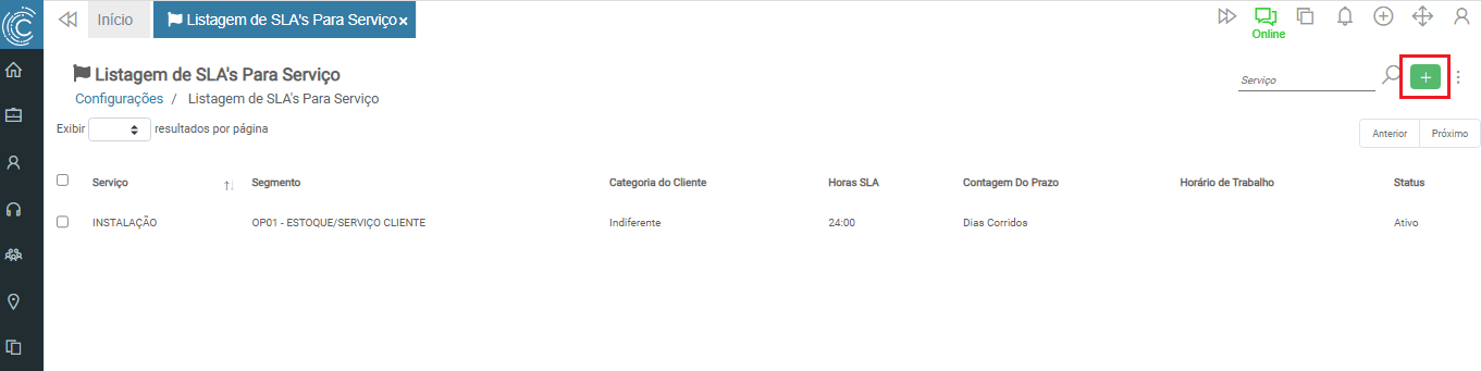 Tipo de Serviço: Tipo de serviço que o SLA será vinculado;