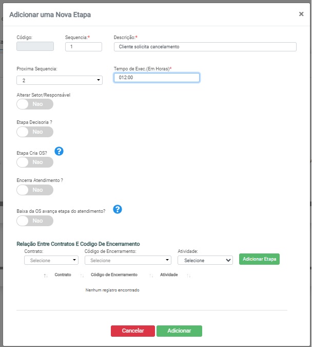 Etapa Cria OS? - Ao ativar essa configuração, uma ordem de serviço será gerada automaticamente nesta etapa, seguindo as configurações do tipo de serviço do atendimento, caso não haja nenhuma outra ordem de serviço já criada ou vinculada a este atendimento.