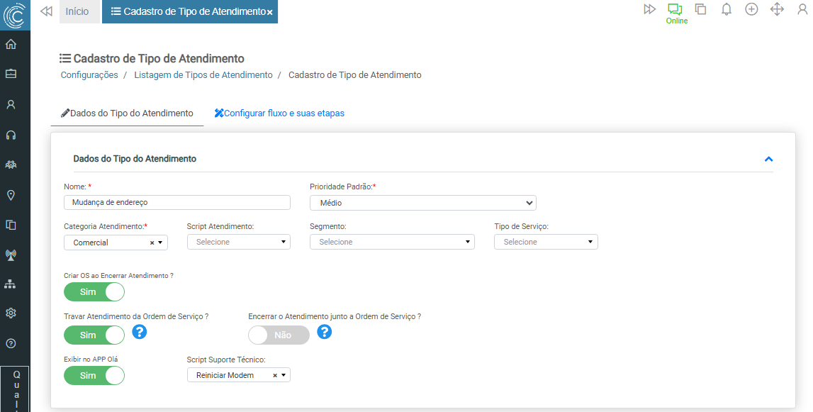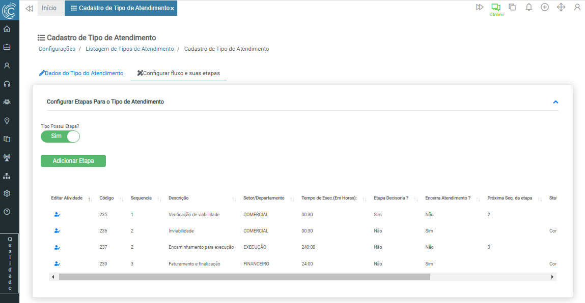 Esta tela visa o usuário cadastrar tipos de atendimentos e assim identificar a melhor abordagem junto ao cliente. Ex.: Solicitar Boleto, Solicitar, Sem acesso, Lentidão, Mudança de Endereço, entre outros. Podendo configurar etapa/fluxo para o tipo de atendimento que o atendente/agente deverá seguir dentro daquele atendimento; Poderá definir um setor responsável pela aquela etapa, um tempo de execução da etapa, uma próxima etapa, entre outros.