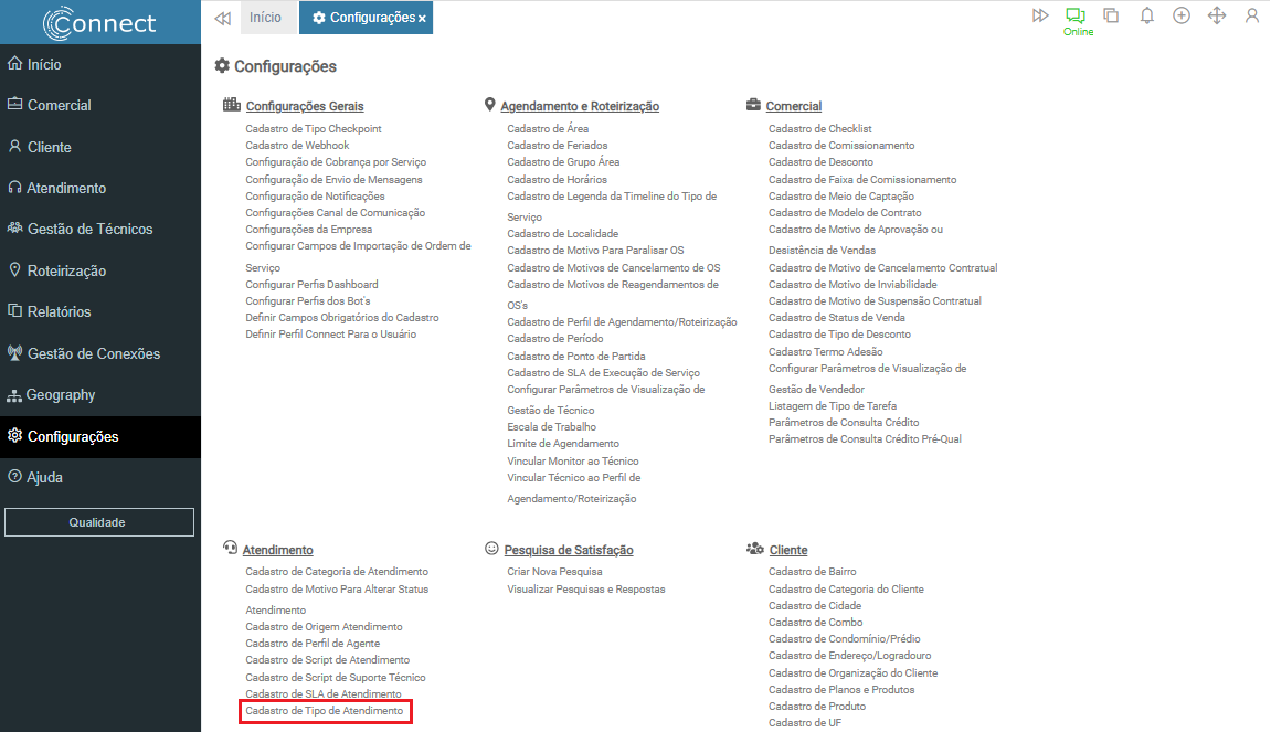 Para realização do cadastro de tipo de atendimento, se faz necessário o cadastro prévio do registro de categoria do atendimento no Aniel Connect;