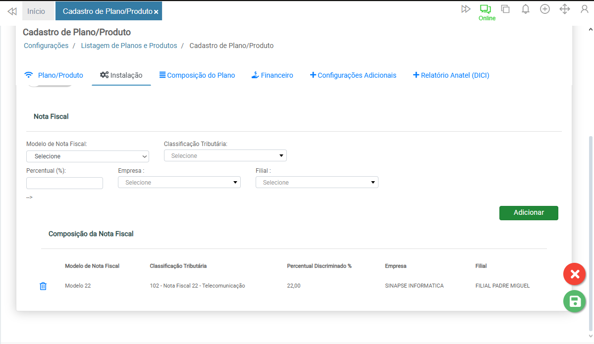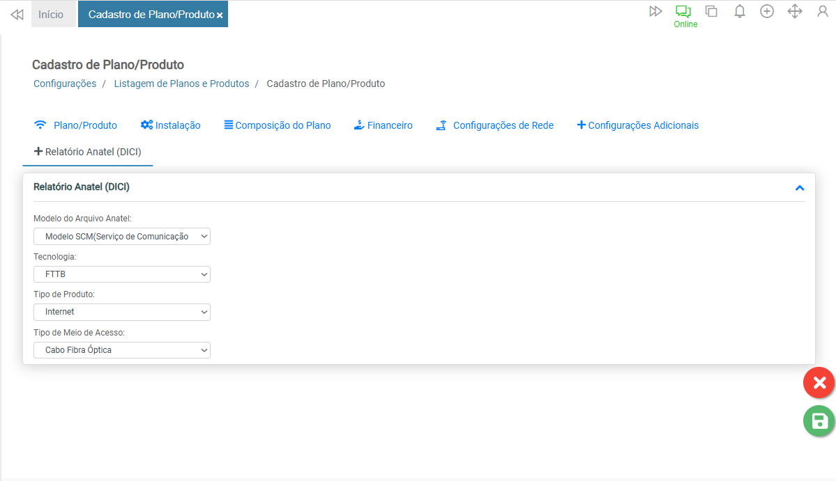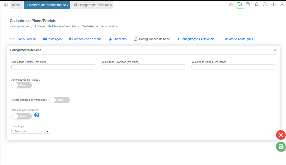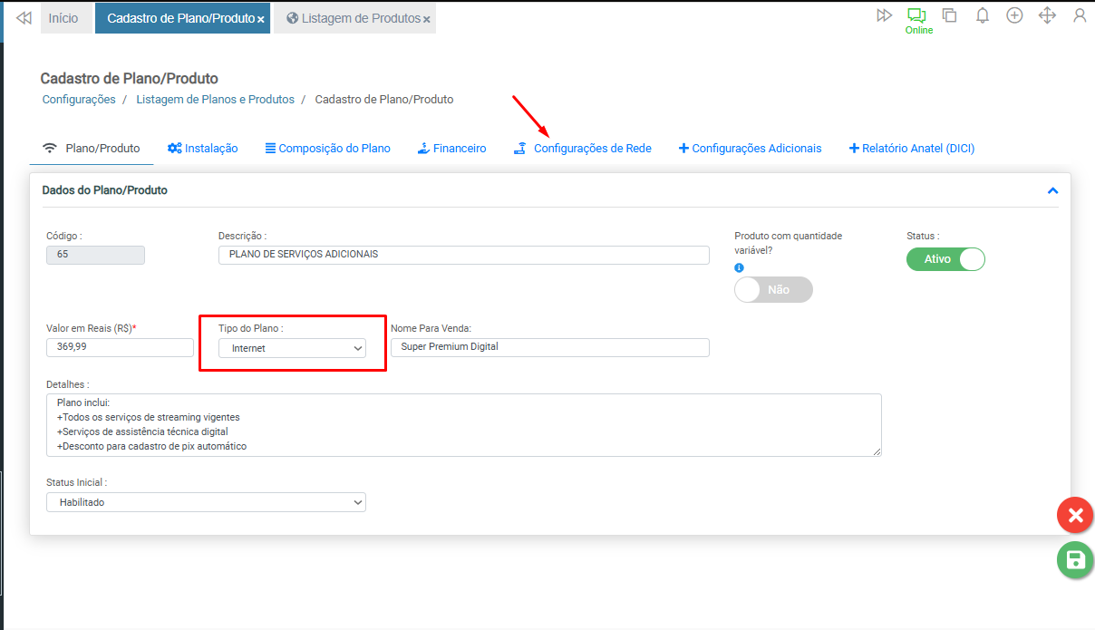 ATENÇÃO! Esta aba somente é exibida quando for selecionado o tipo de plano INTERNET.