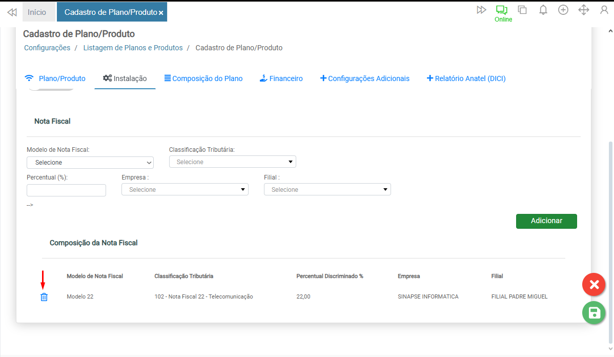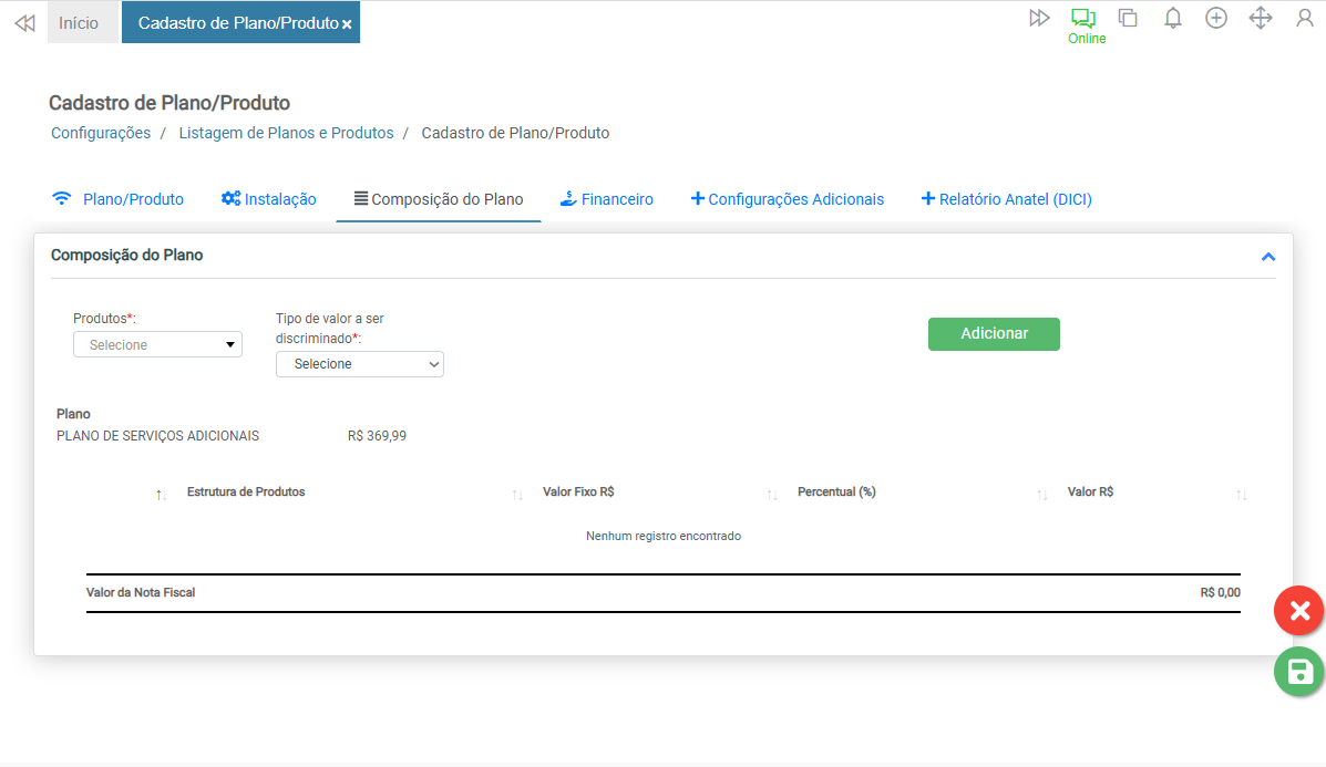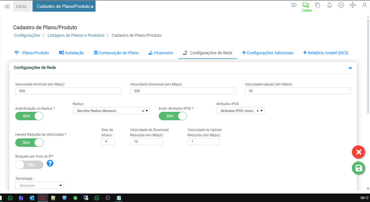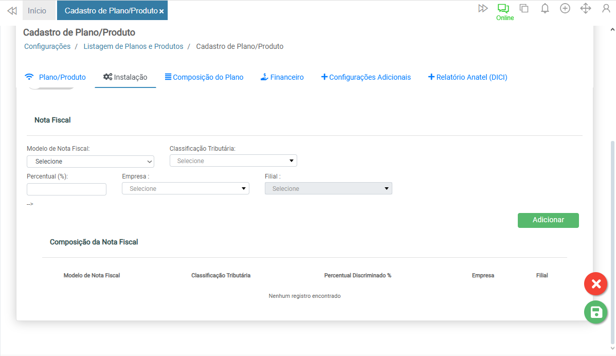 ATENÇÃO! Esta aba somente é exibida quando for selecionado o tipo de plano INTERNET.