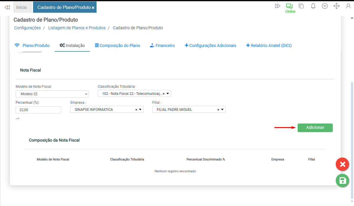 Após isso, o item será listado no bloco Composição da Nota Fiscal.