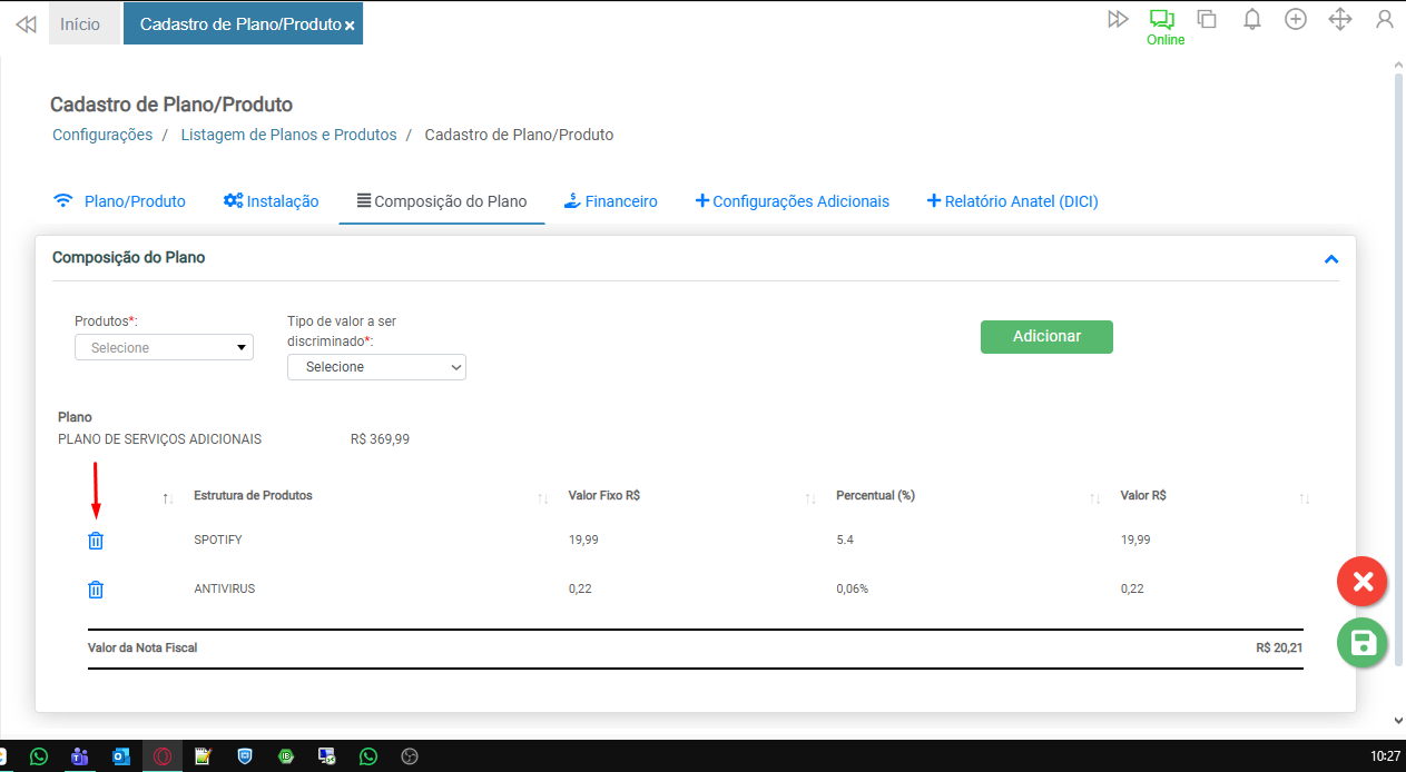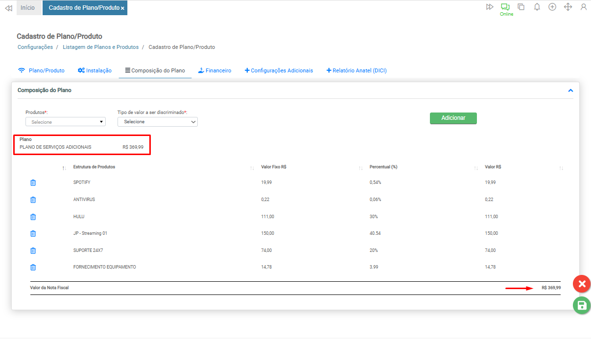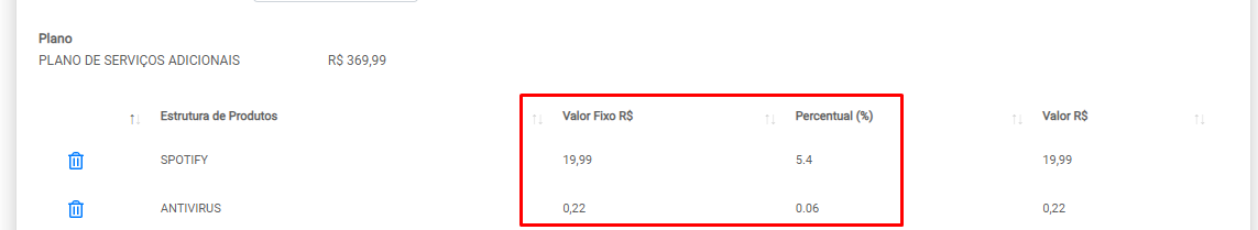 Utiliza Plano adicional? - Caso o plano deva ser comercializado acompanhado de outros itens, ative esta opção e, ao ser apresentado o campo Selecione os Planos/Produtos adicionais, selecione o item que deve ser associado e clique no botão Adicionar. Ao ativar esta opção, também será exibido o campo Lista dos Planos/Produtos adicionais, onde serão listados os itens associados ao plano e, para remover, clique na lixeira à esquerda do item;