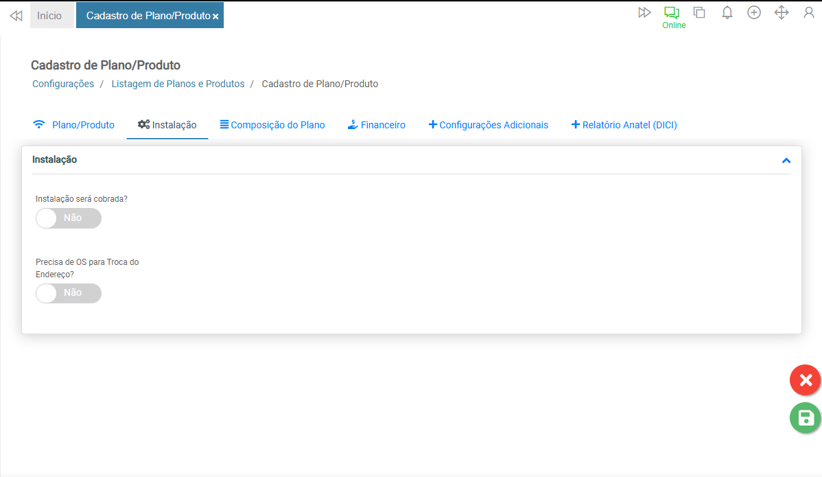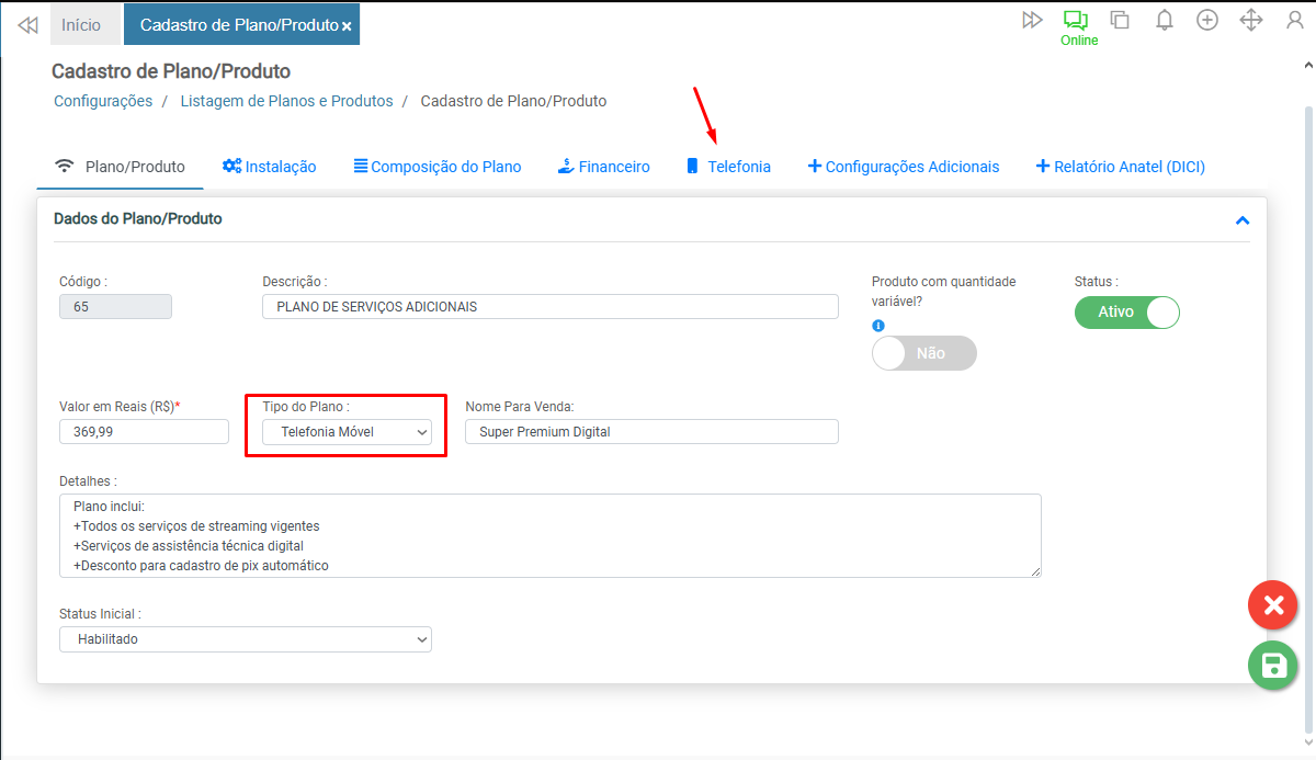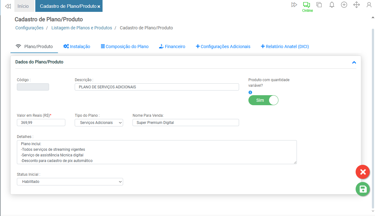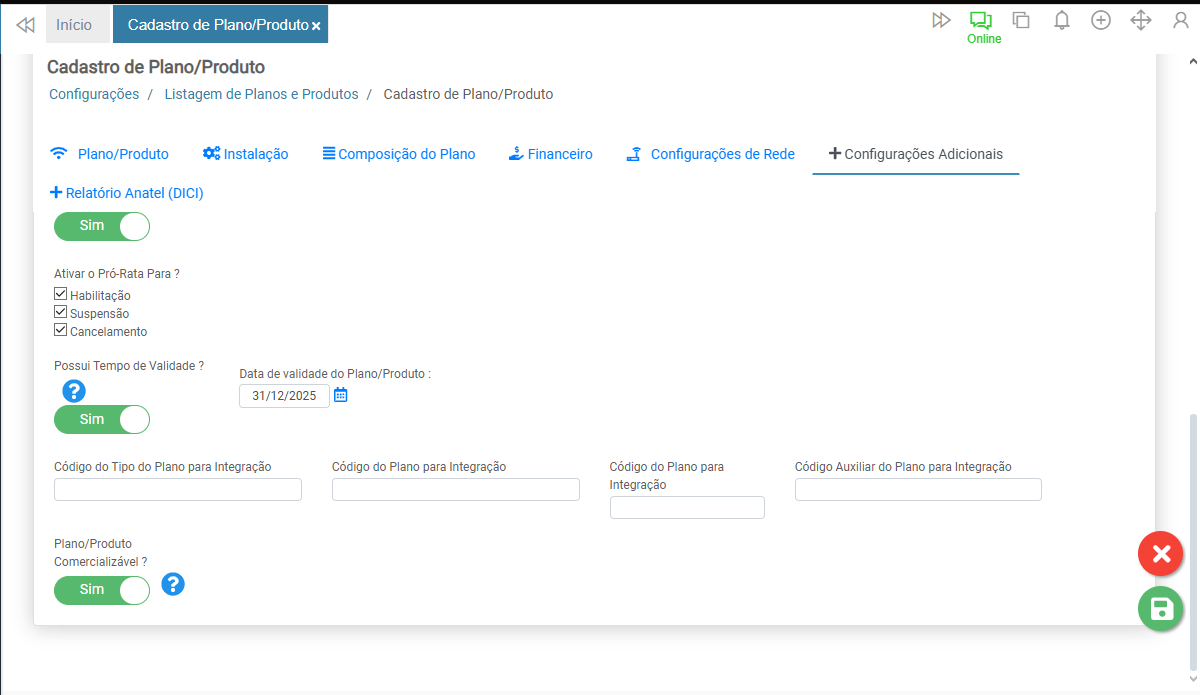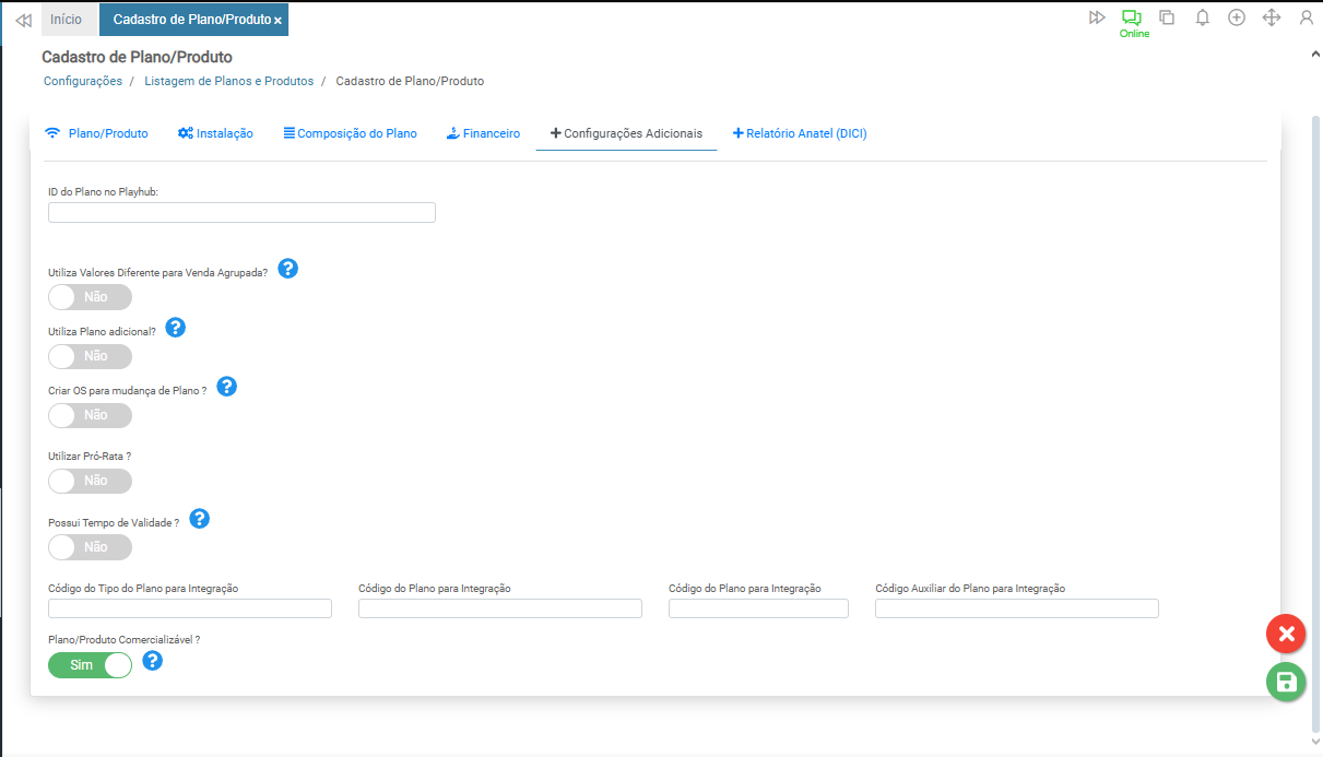 Plano/Produto Comercializável? - Esta opção vem ativa por padrão. Caso seja necessário tornar indisponível o vínculo ao Cliente já cadastrado ou a comercialização deste plano, defina como Não.