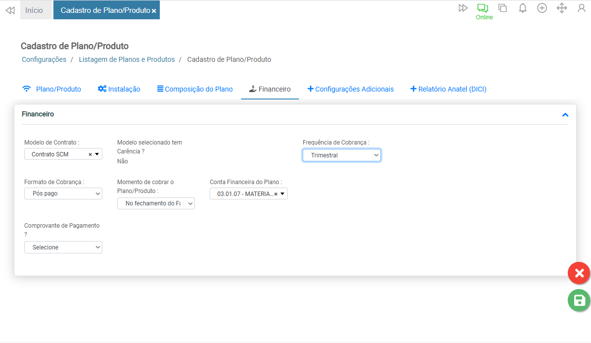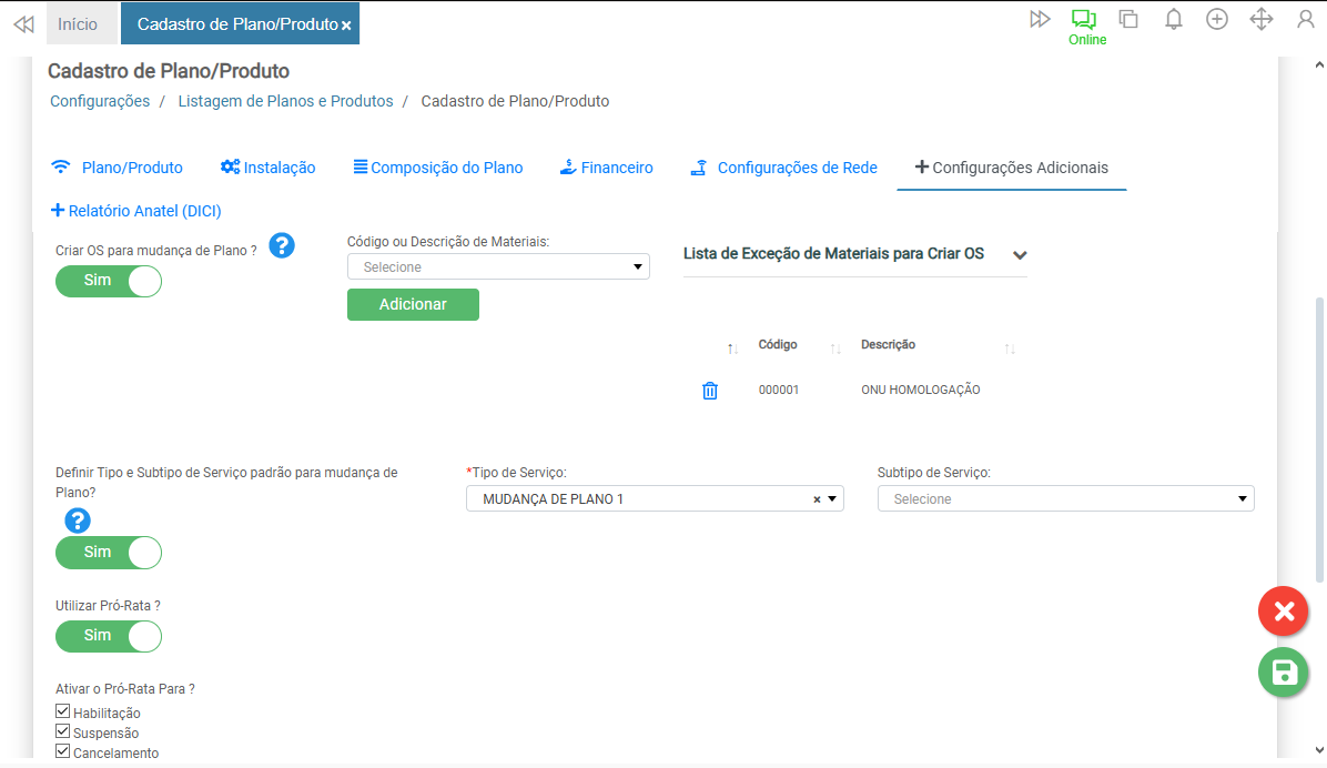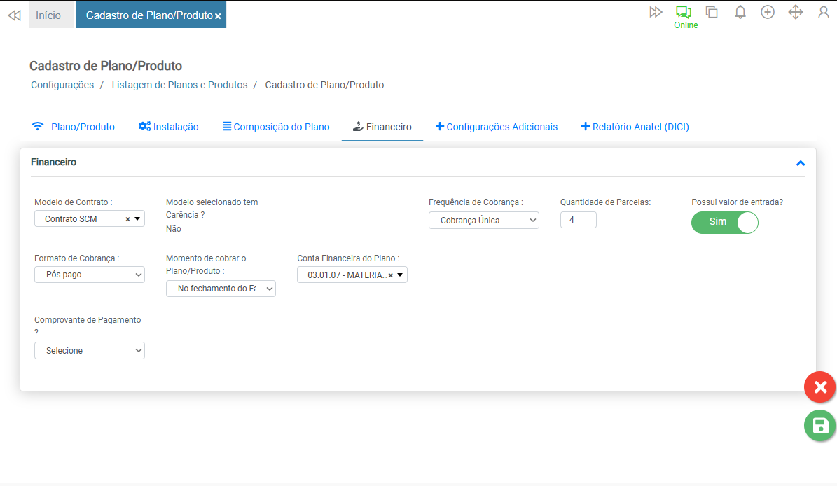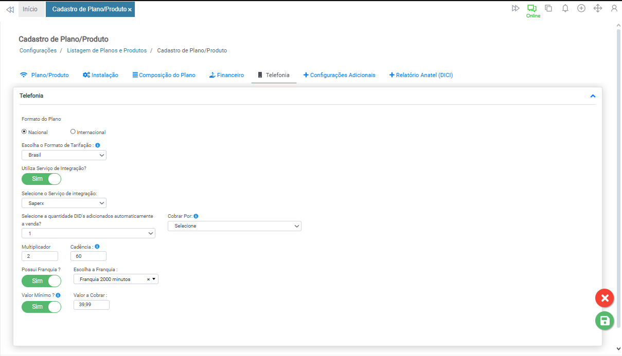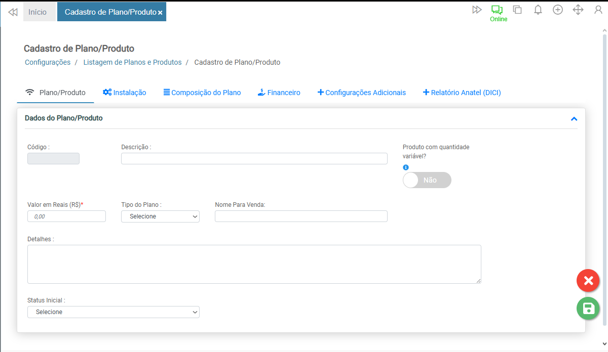 Plano/Produto Comercializável? - Esta opção vem ativa por padrão. Caso seja necessário tornar indisponível o vínculo ao Cliente já cadastrado ou a comercialização deste plano, defina como Não.