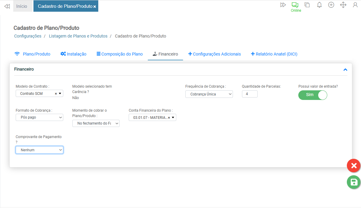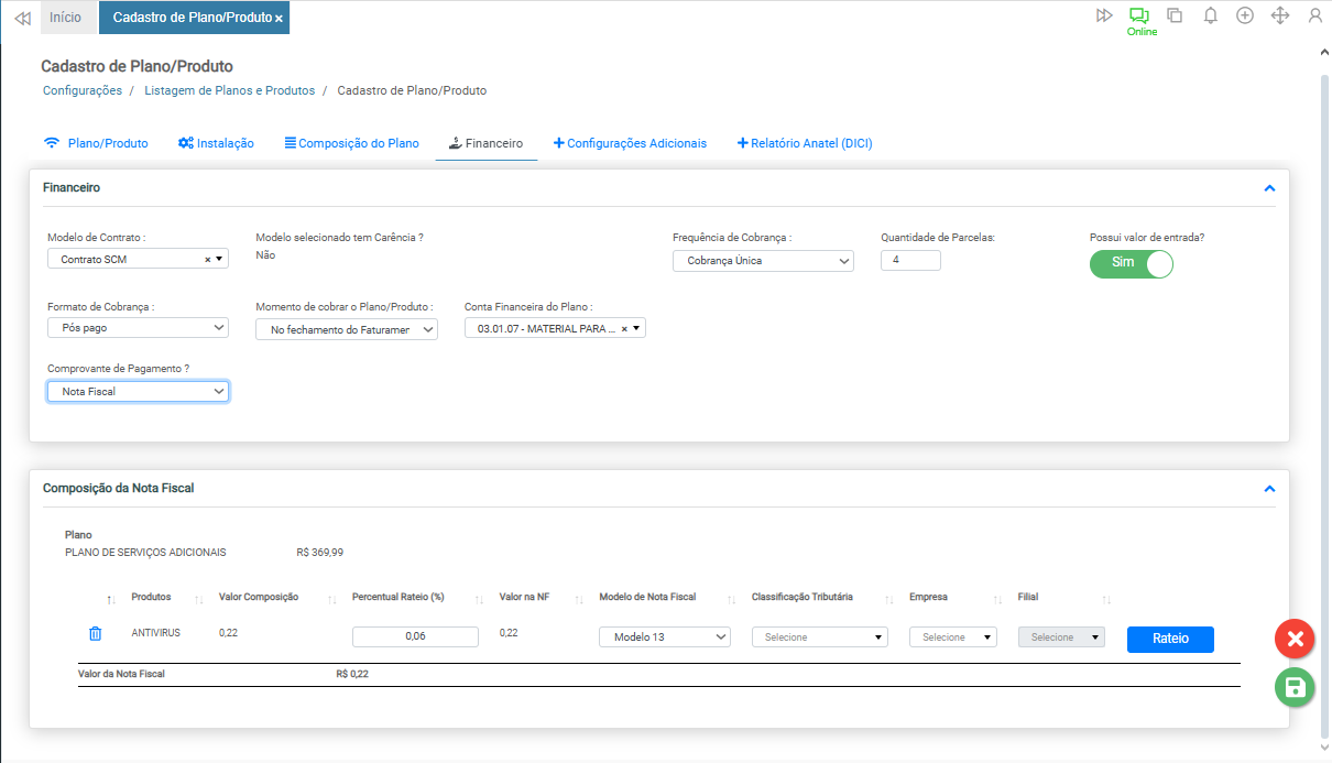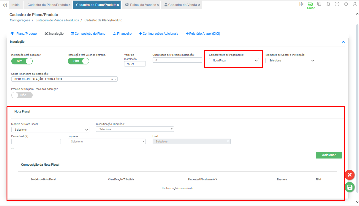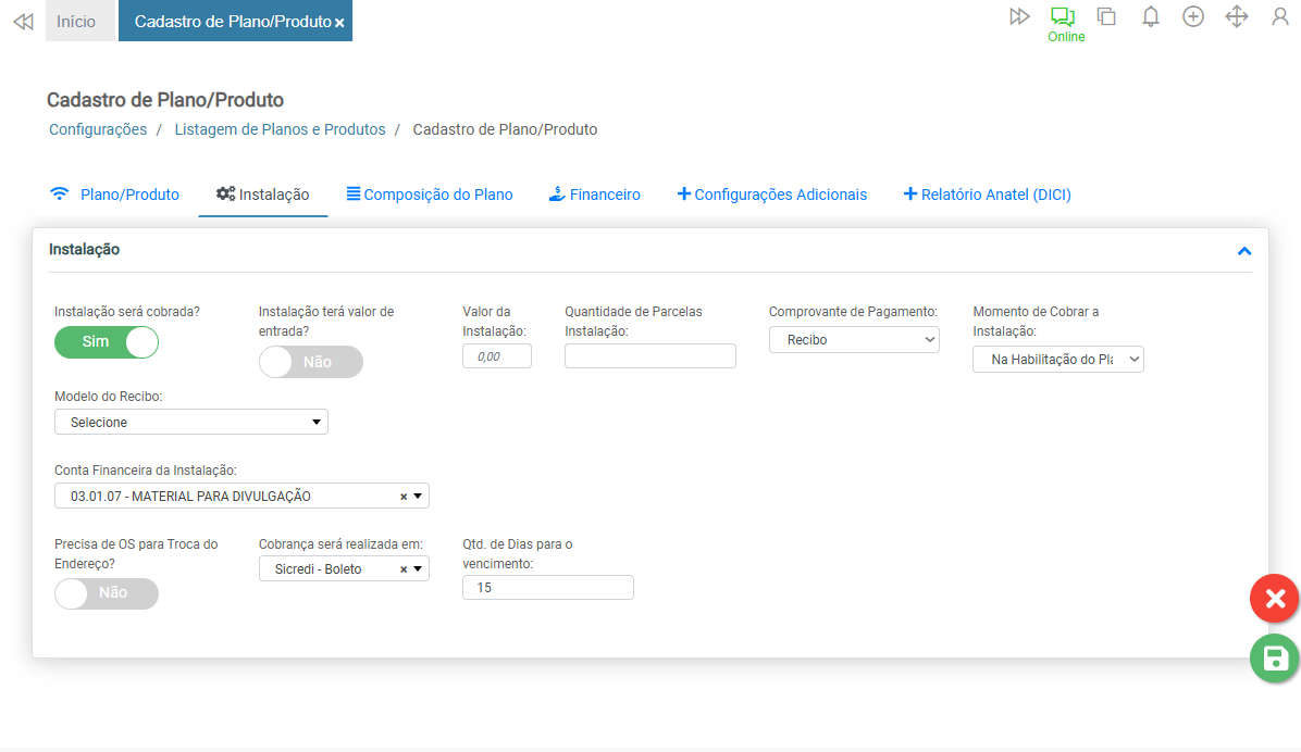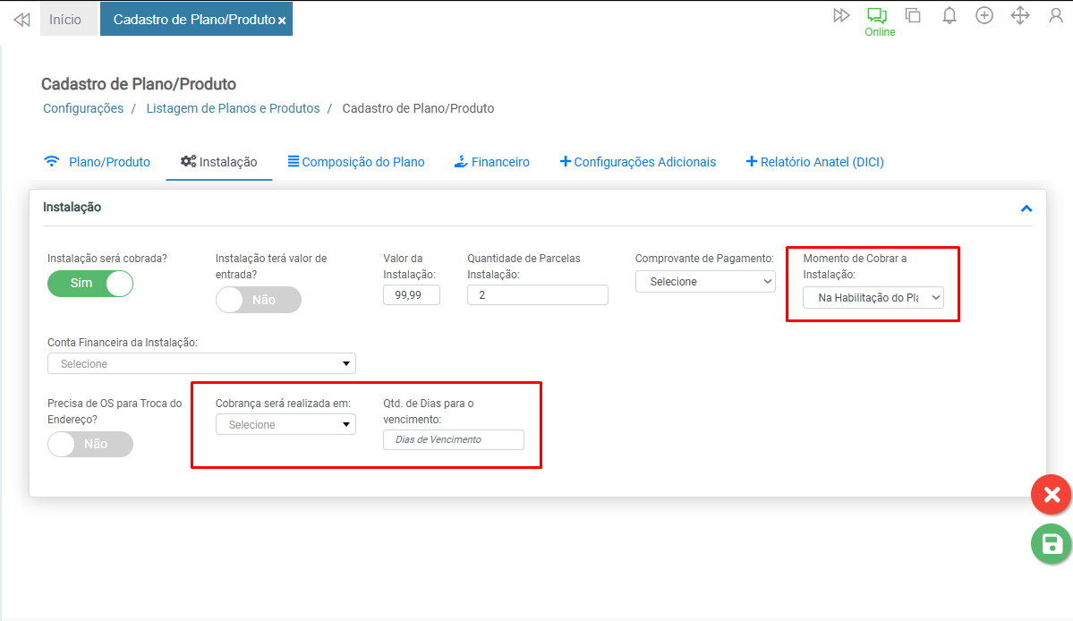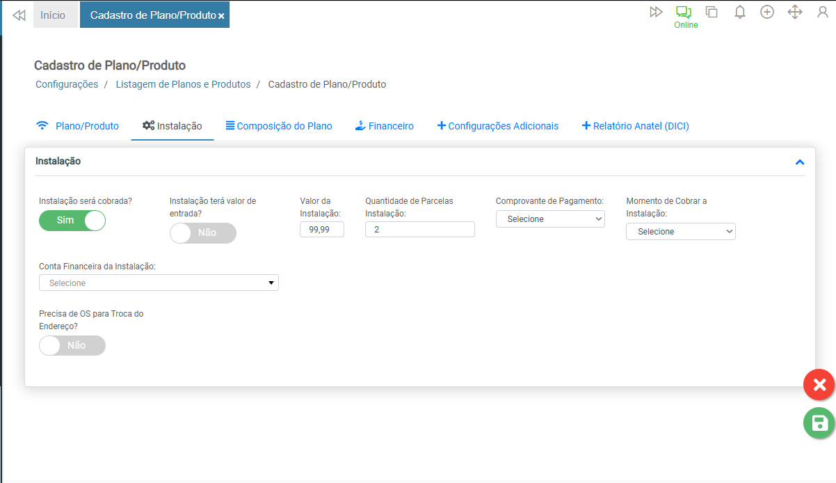 Instalação será cobrada? - Ative está configuração caso a instalação do plano seja cobrada. Após ativar, serão habilitados outros campos: