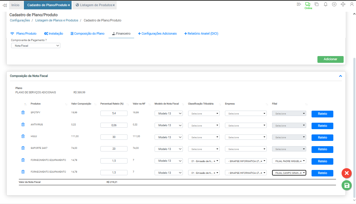 Caso algum produto deva ter nota fiscal dividida para mais de um CNPJ, clique no botão Rateio na linha do produto.
