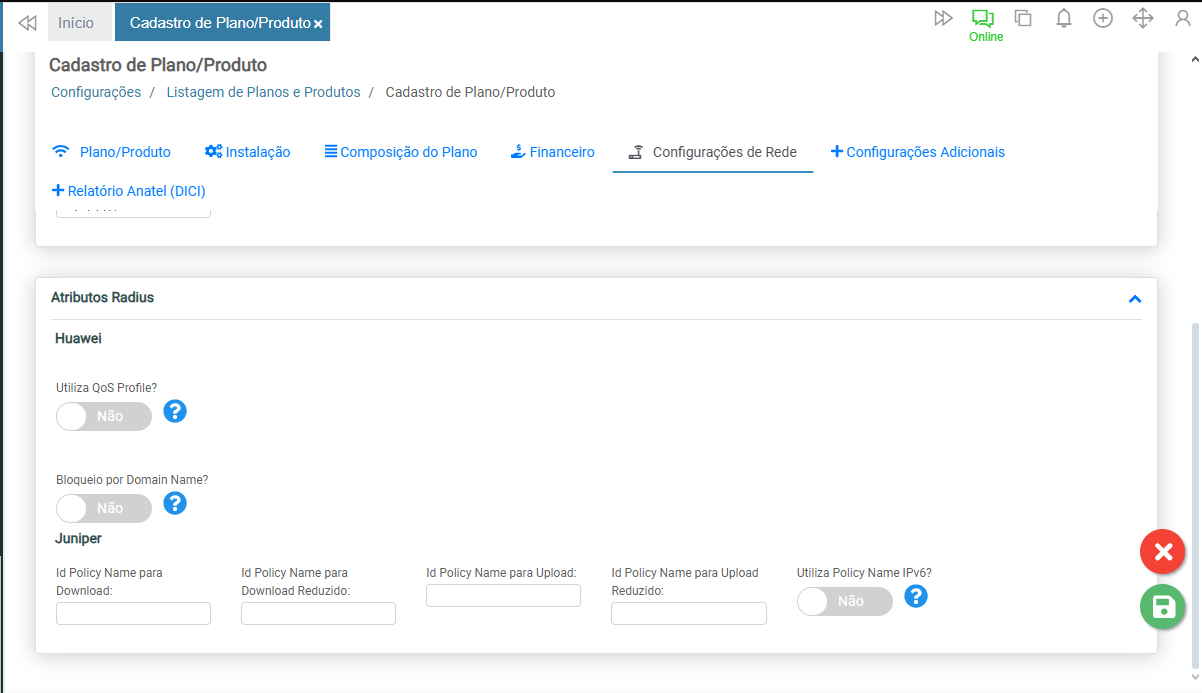 ¶ Aba Configurações de Rede - Bloco Atributos Radius