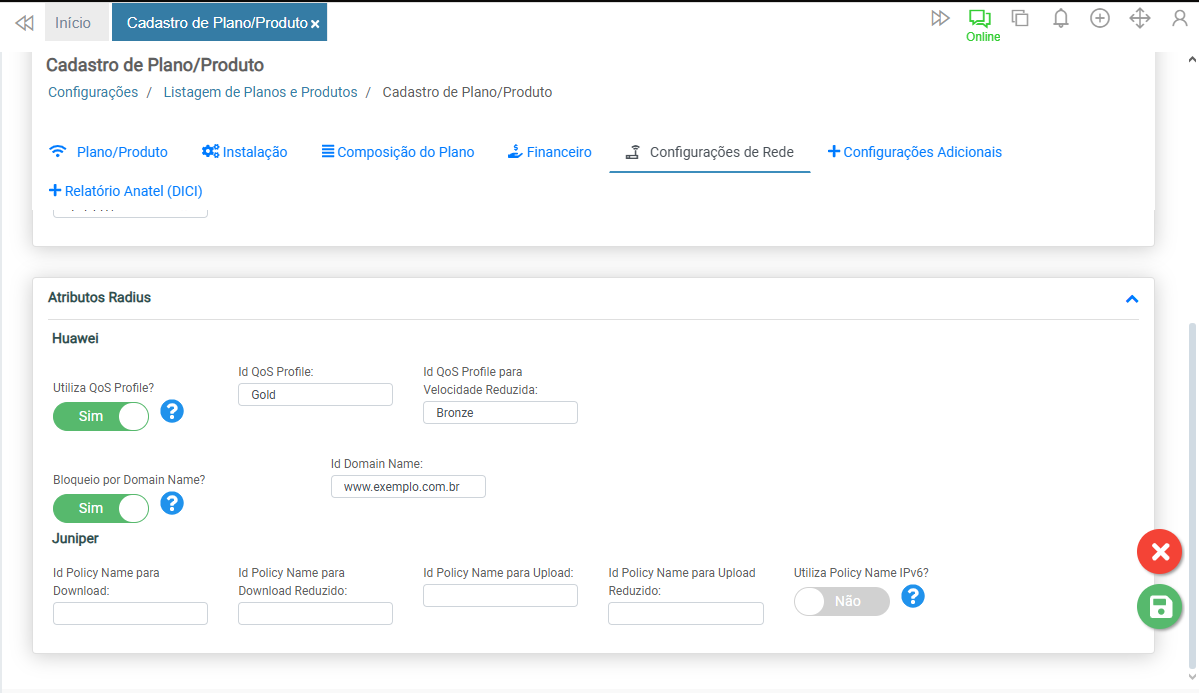 Id QoS Profile para Velocidade Reduzida - Exibida somente quando a opção Haverá Redução de Velocidade; está ativa, informe a identificação dos atributos do plano no servidor Radius quando a velocidade estiver reduzida por inadimplência;
